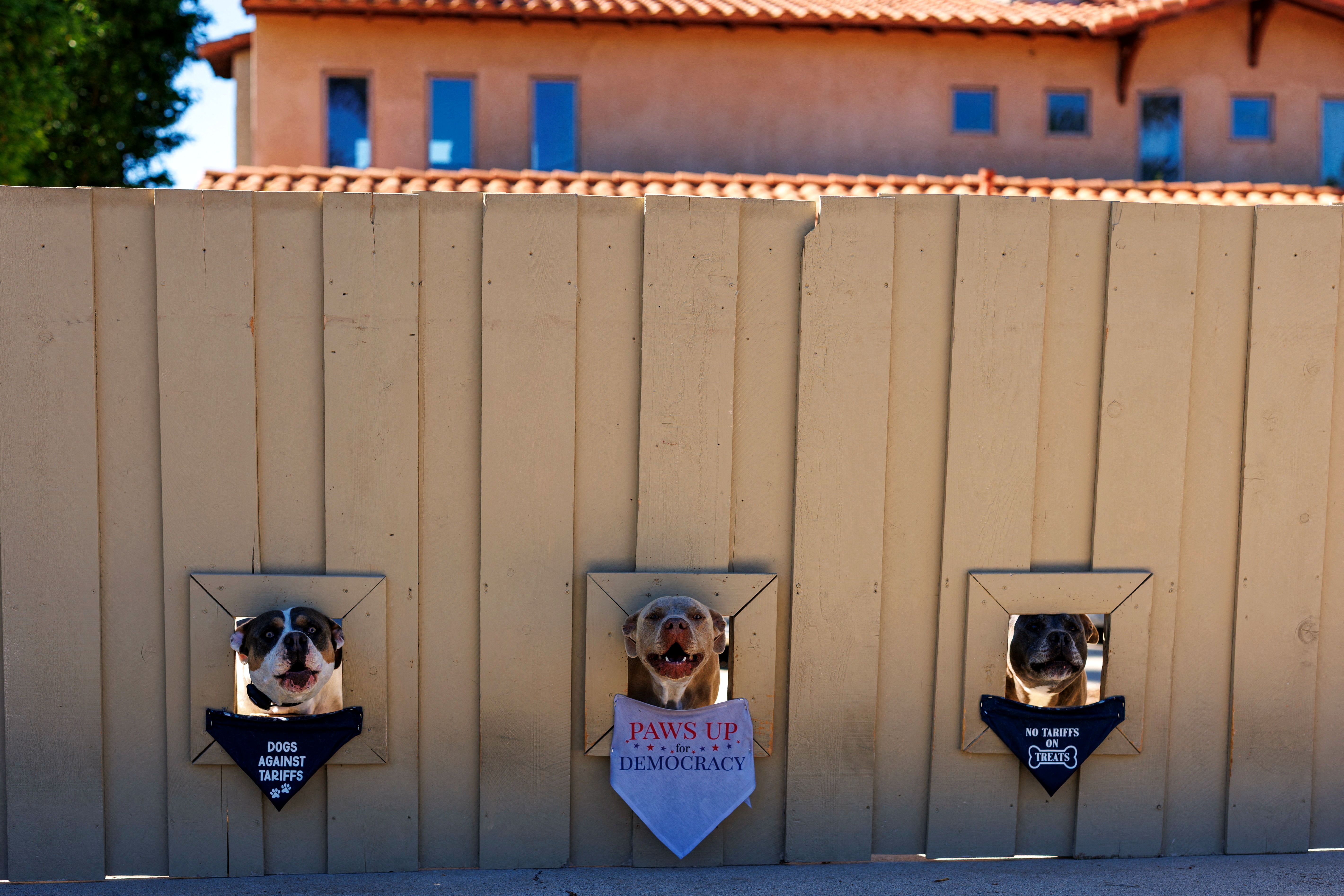 Dogs Buddy, Penny and Honey wait for the mailman from windows cut through a fence at their owners home in Encinitas, California, U.S. October 20, 2025. (Photo by Mike Blake/Reuters)