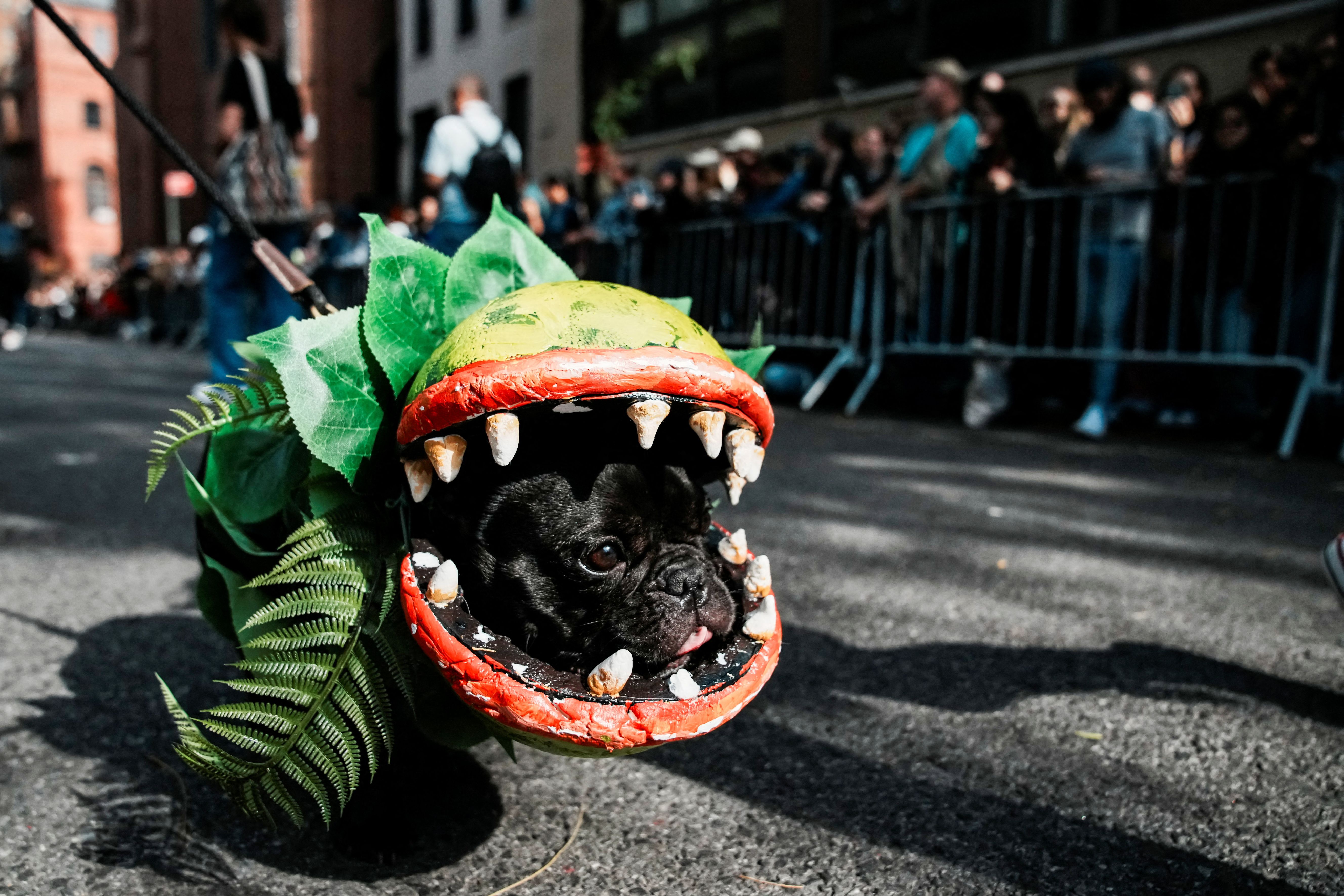 Halvor, a French bulldog in costume as Audrey 2, from Little Shop of Horrors, attends the Annual Tompkins Square Halloween Dog Parade in New York City, U.S., October 19, 2025. (Photo by Eduardo Munoz/Reuters)