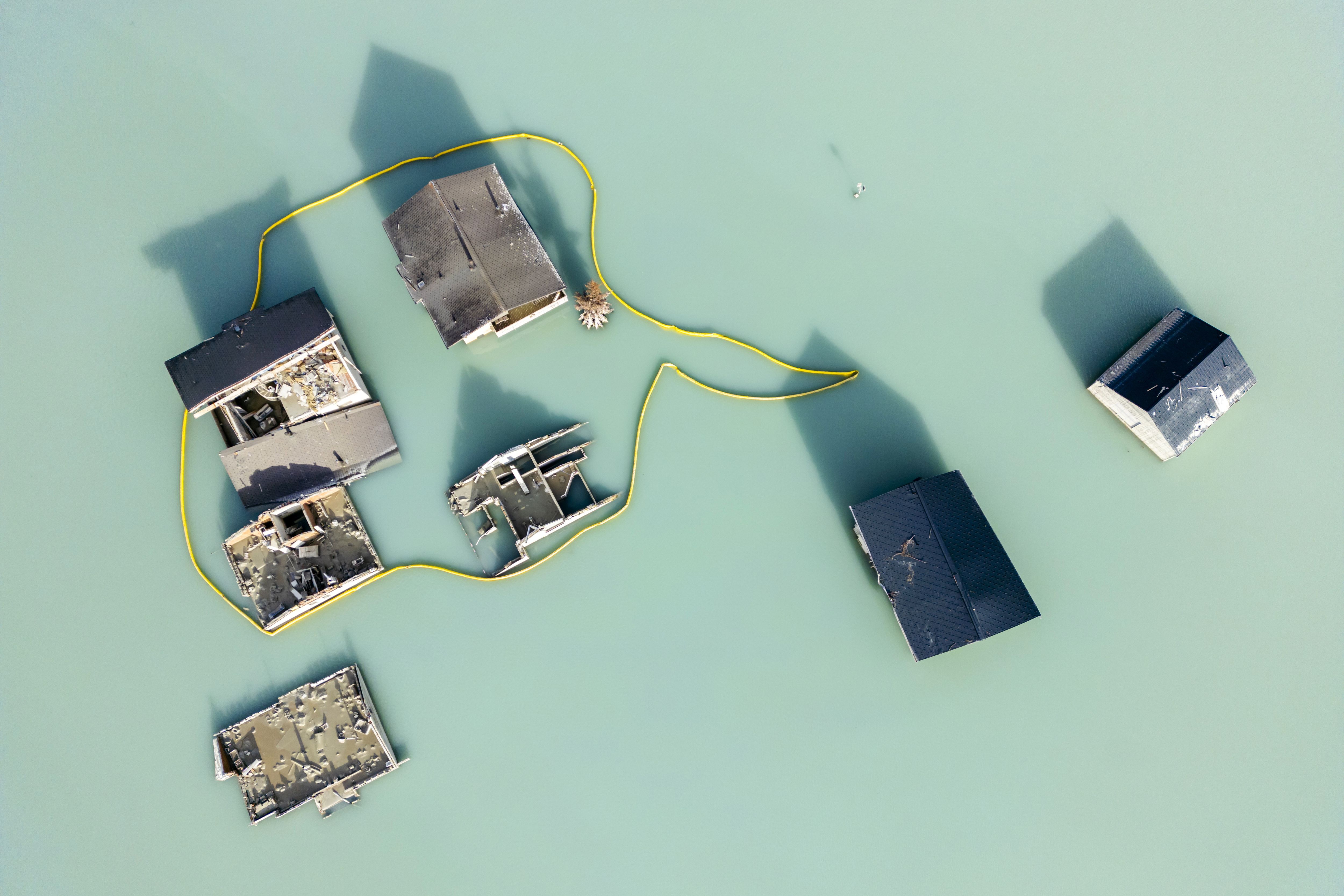 An aerial picture taken with a drone shows the a destroyed and flooded houses in the village of Blatten, 4 months after a landslide destroyed the village, in Blatten, Switzerland, 30 September 2025 (issued 02 October 2025). On May 28, 2025, the village of Blatten in the Loetschental valley, Canton of Valais, was devastated when a section of the Birch Glacier collapsed, sending an avalanche of rock, ice, and debris into the Loetschental valley. About 90 percent of the village, including 130 houses and the parish church, was buried. The debris blocked the Lonza River, creating a large lake and raising concerns about flooding. The authorities in Blatten had already evacuated the village in the week before the glacier collapse, but a local shepherd lost his life. (Photo by Michael Buholzer/EPA)