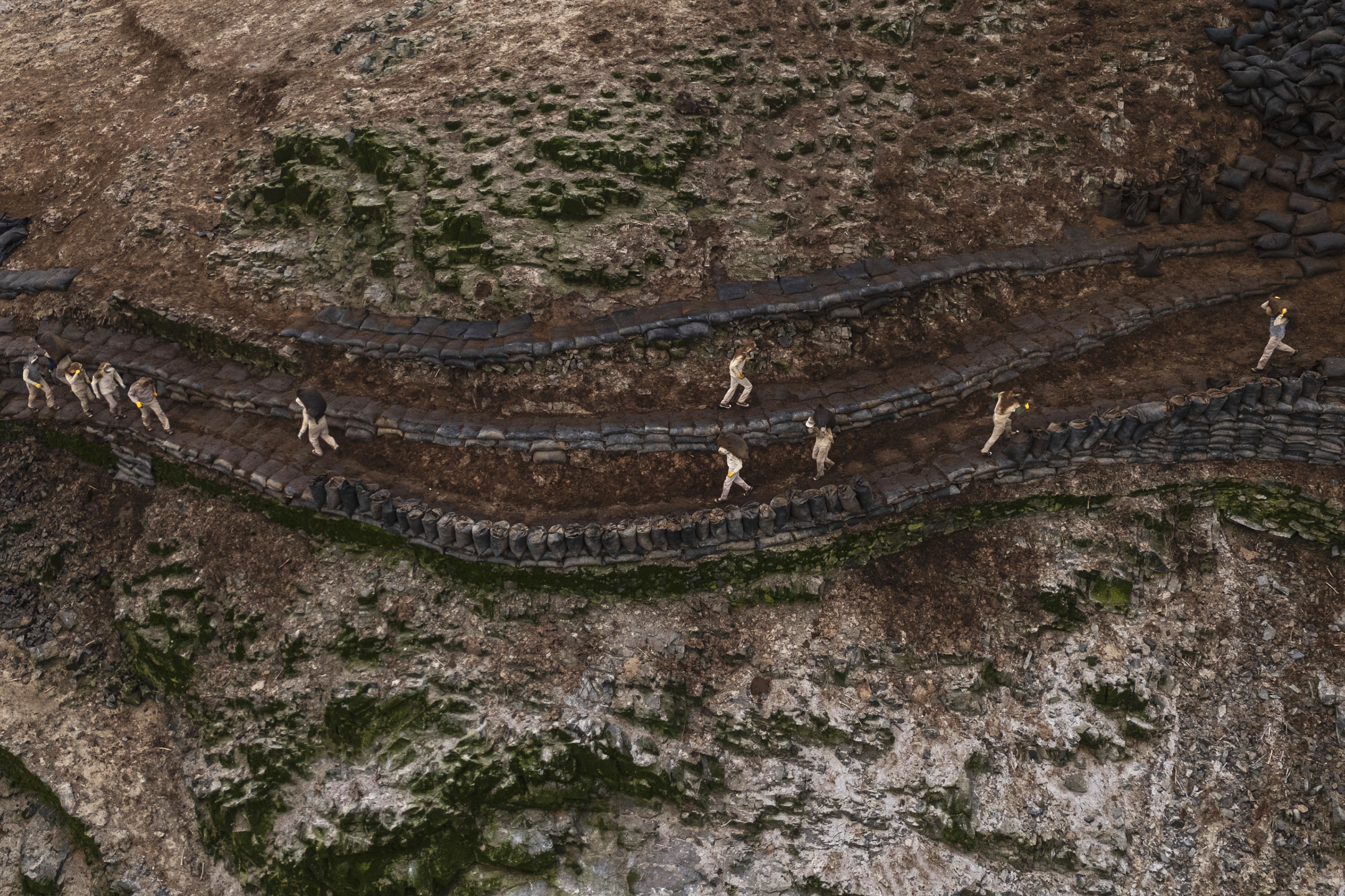 Workers are seen carrying sacks full of guano on Isla Santa, located in the province of Chimbote, department of Ancash in northern Peru on October 3, 2025. Derived from seabird excrement, guano enriched Peru in the 19th century. This natural fertilizer, which is still collected under difficult conditions, now only benefits small farmers. On Santa Island, north of Lima, a hundred workers between the ages of 20 and 60 extract guano that has accumulated over decades from dawn onwards. (Photo by Ernesto Benavides/AFP Photo)