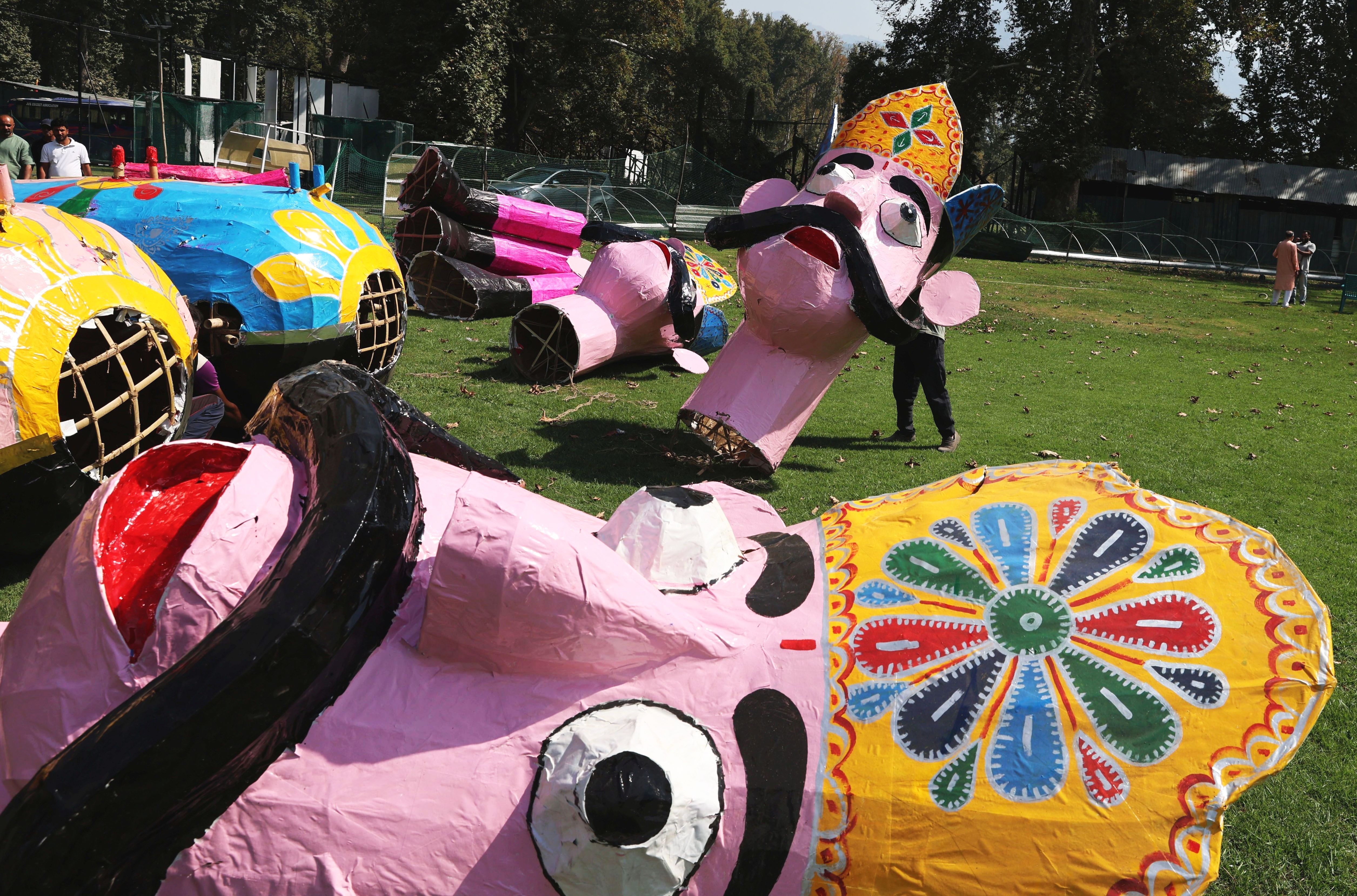 A labourer prepares an effigy of demon king Ravana ahead of Dussehra celebrations in Srinagar, the summer capital of Indian Kashmir, 01 October 2025. The effigies are burnt during the Hindu festival, which commemorates the triumph of Lord Rama over Ravana and marks the victory of good over evil. Dussehra, also known as Vijayadashami, falls on 02 October this year. (Photo by Farooq Khan/EPA)
