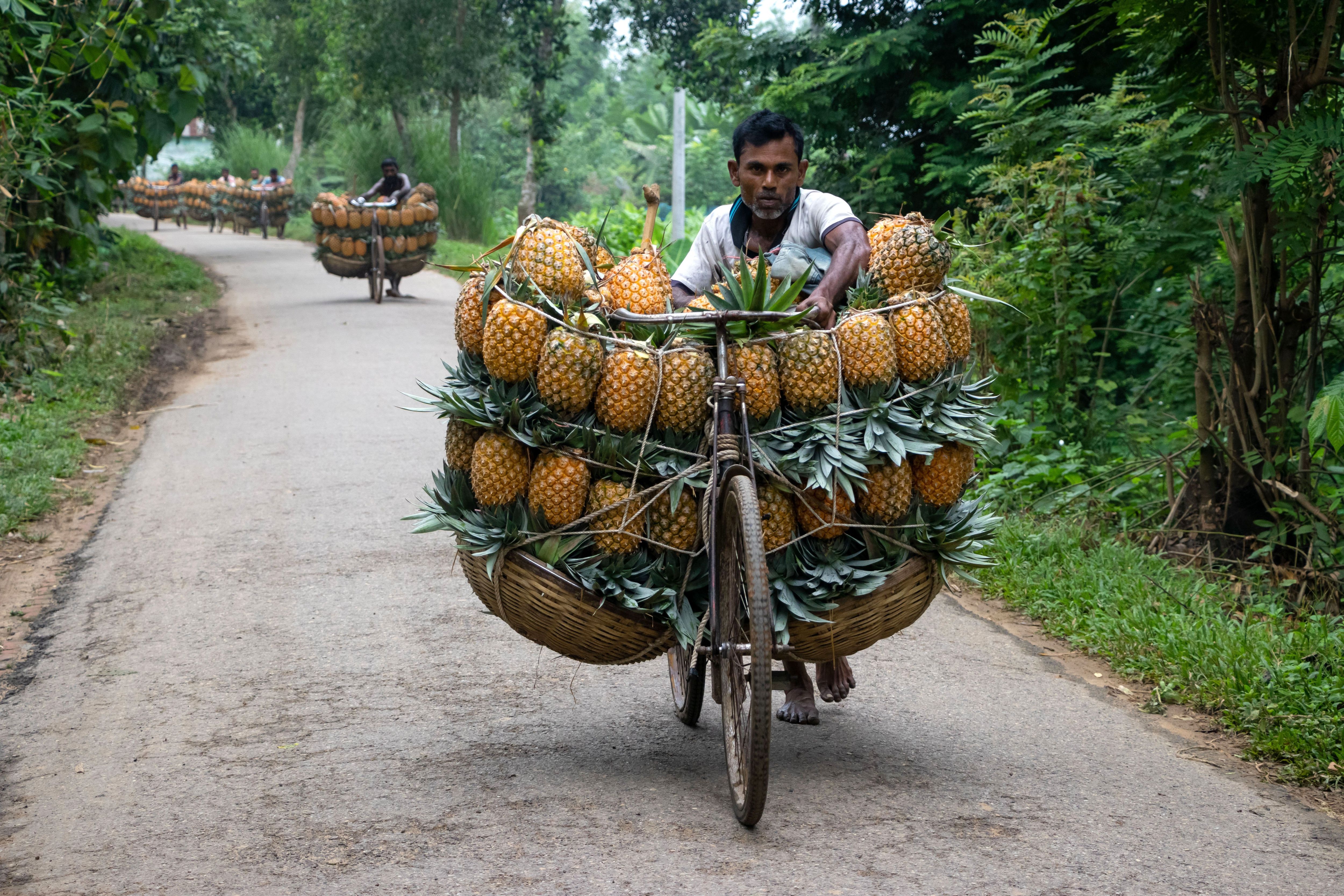 Farmers parade bicycles laden with pineapples at a market in the town of Tangail, northwest of Dhaka, Bangladesh on July 16, 2025. The use of bicycles reduces transportation costs for the farmers, who can carry up to 100 pineapples on each bike. The harvested pineapples are loaded in bicycles and pushed all the way through a forest to the biggest pineapple market in Bangladesh. Pineapple has been cultivated on 8,000 hectares of land where 3,00,000 tonnes of pineapple are produced in Tangail, Bangladesh, the largest growing area of the country. This fruit cultivation boosts the agroforestry industry in Bangladesh. (Photo by Joy Saha/ZUMA Press Wire/Rex Features/Shutterstock)