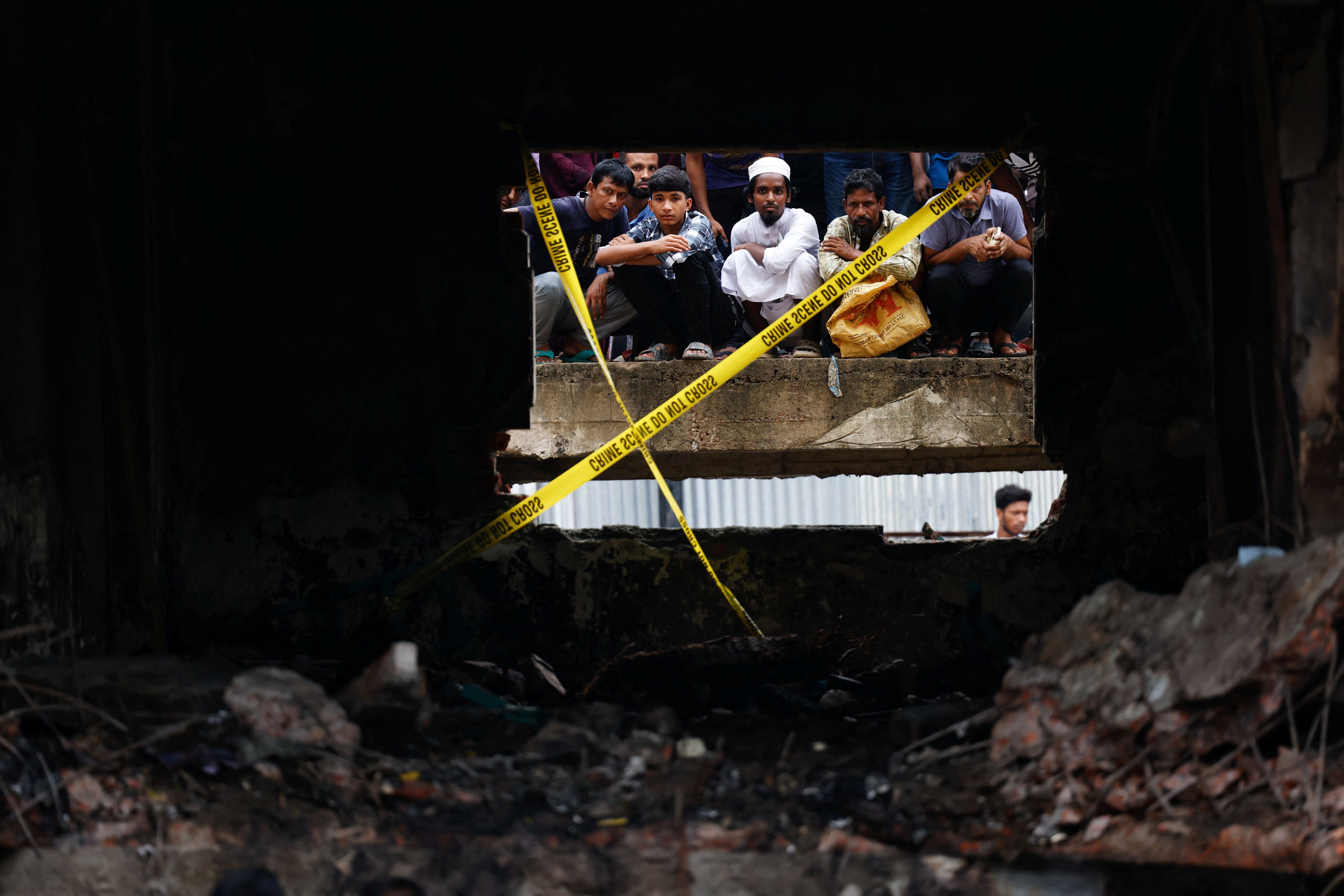 On lookers watch through a damaged window as members of Bangladesh Air Force work at the site, after an air force training aircraft crashed into a building belonging to Milestone School and College, in Dhaka, Bangladesh, on July 22, 2025. (Photo by Mohammad Ponir Hossain/Reuters)