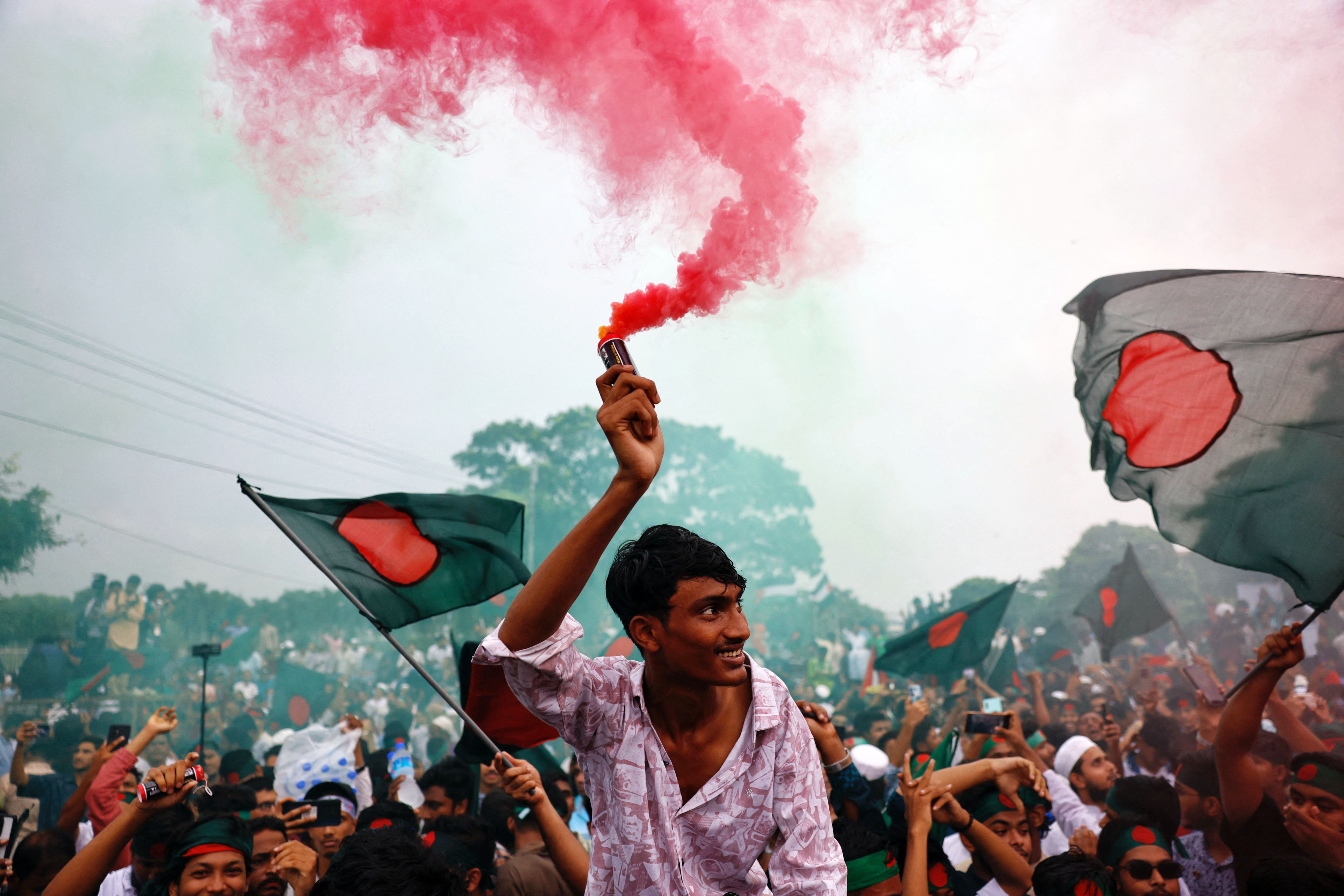 People use coloured smoke and wave flags as they celebrate the one year anniversary since student-led protests ousted Bangladesh's former Prime Minister Sheikh Hasina, at Manik Mia Avenue, outside of the parliament building, in Dhaka, Bangladesh, on August 5, 2025. (Photo by Mohammad Ponir Hossain/Reuters)