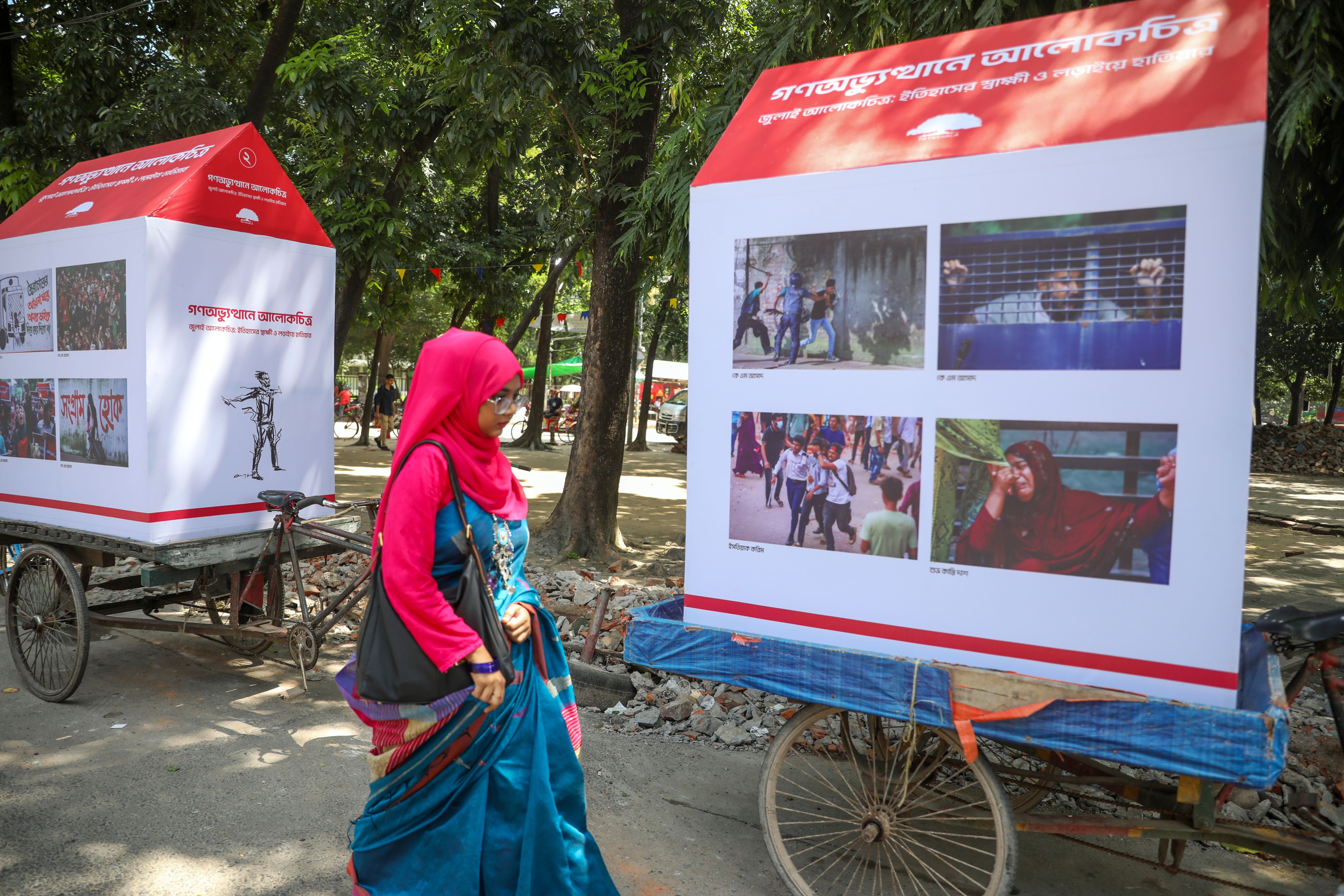 A woman walks past photographs on display at a street exhibition titled “Photographs of the Mass Uprising: July Photographs – Witness to History & a Weapon in Struggle”, held to commemorate the 1st anniversary of the uprising in Dhaka, Bangladesh, 11 August 2025. The exhibition is organized by the South Asian Media Institute “Pathshala”, showcasing photographs on rickshaw vans that will be displayed in various locations across Dhaka to honor the anniversary of the July-August mass uprising that resulted in the ousting of former premier Sheikh Hasina. (Photo by Monirul Alam/EPA)