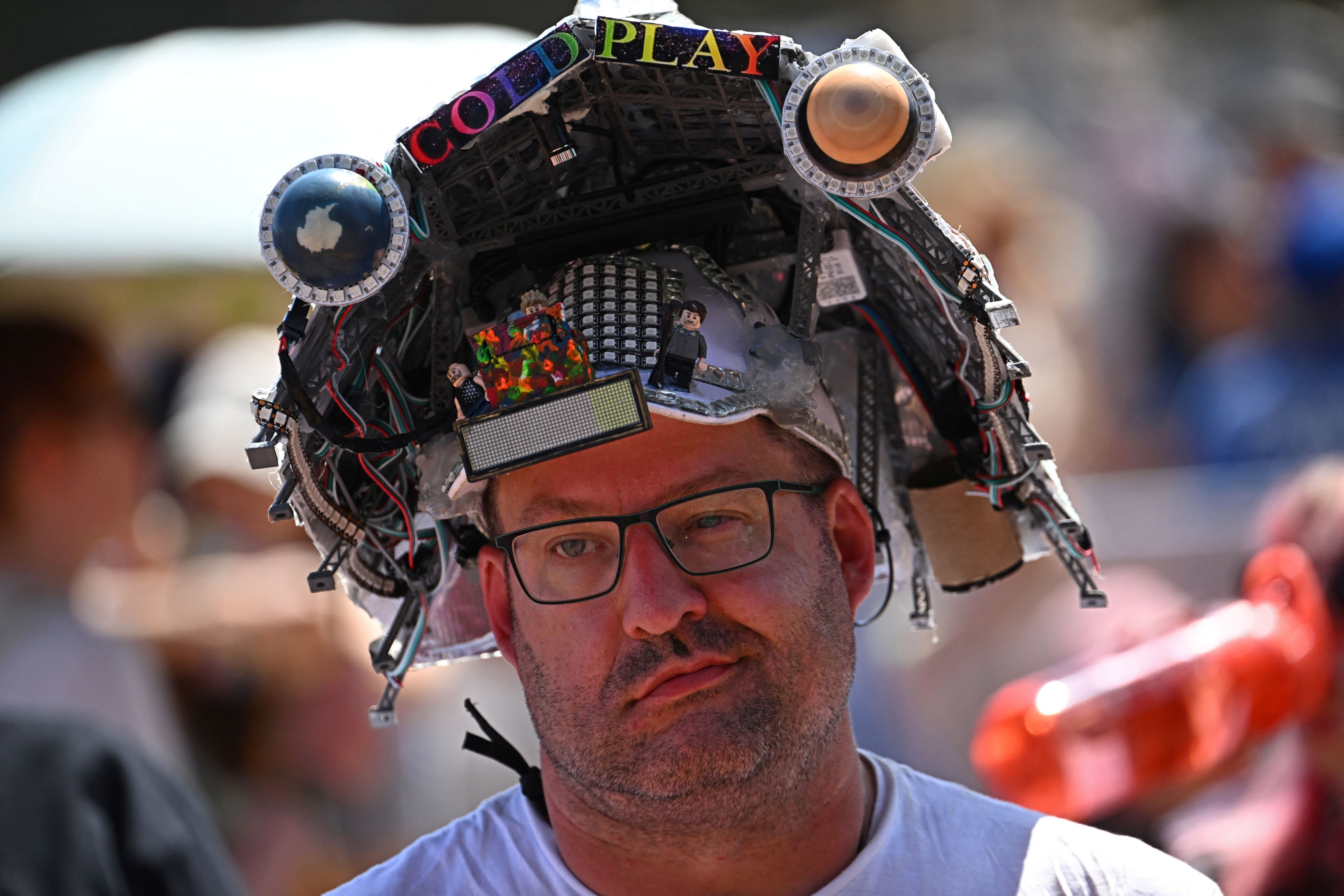 A Coldplay fan watches Femi Kuti perform on the Pyramid Stage during the Glastonbury Festival at Worthy Farm, in Pilton, near Glastonbury, Somerset, Britain, June 29, 2024. (Photo by Dylan Martinez/Reuters)