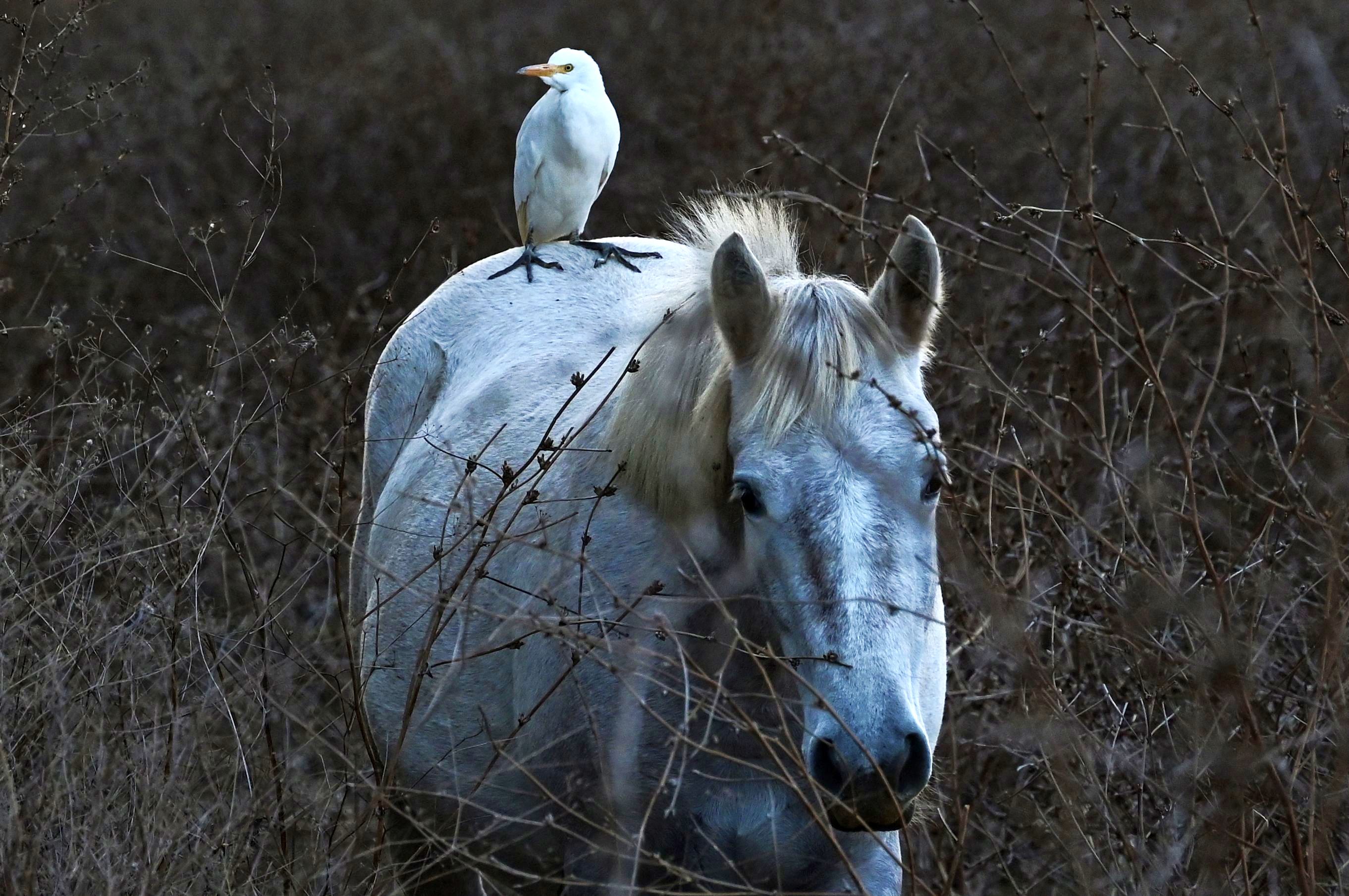 An egret stands on the back of a Camargue horse in a field near Villeneuve les Beziers, Southern France, on October 15, 2025. (Photo by Gabriel Bouys/AFP Photo)