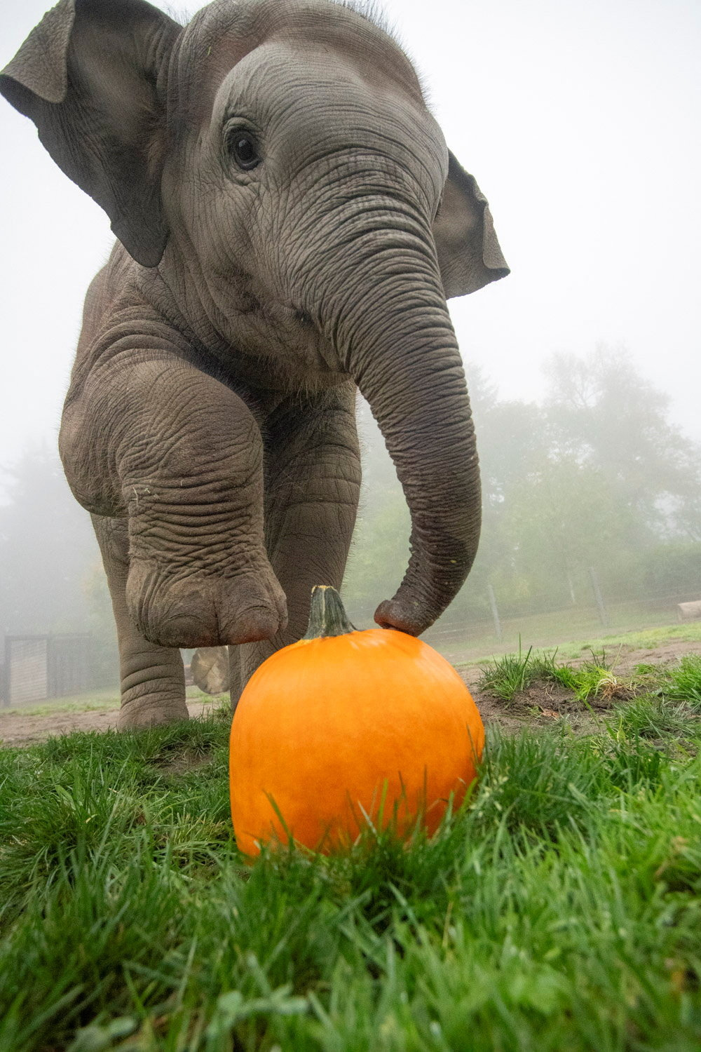 An elephant calf, Tula-Tu plays with a pumpkin, as the Oregon Zoo celebrates Halloween during the 27th annual Squishing of the Squash, in Portland, Oregon, U.S., October 3, 2025. (Photo by Oregon Zoo/Handout via Reuters)