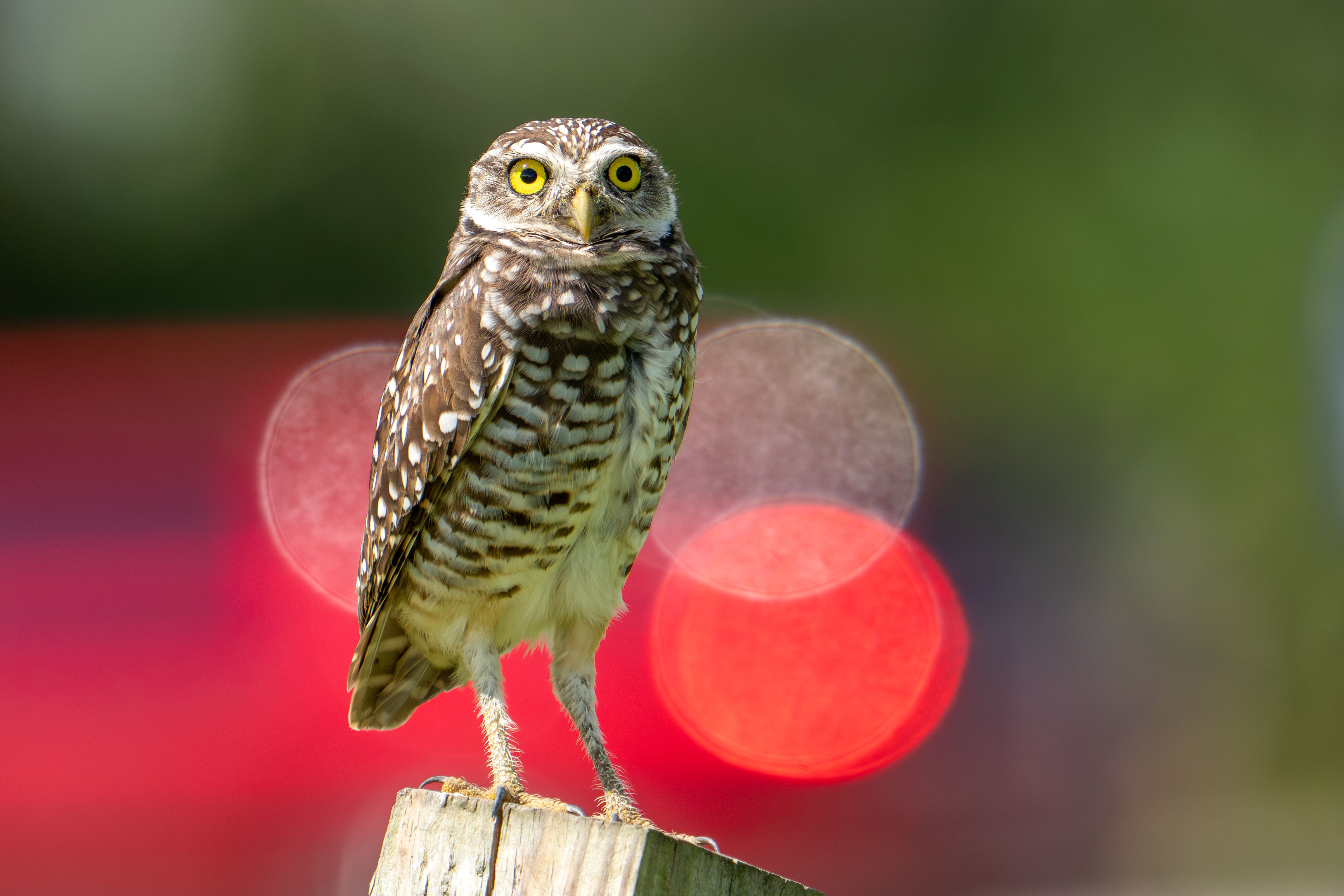 A Burrowing Owl stands guard near its burrow in Davie, Florida on October 21, 2025. Burrowing Owls nest and roost in underground burrows and feed on insects, along with small lizards, mammals, and birds. When threatened, they produce a hissing sound that mimics a rattlesnake to scare off predators. (Photo by Ronen Tivony/NurPhoto/Rex Features/Shutterstock)