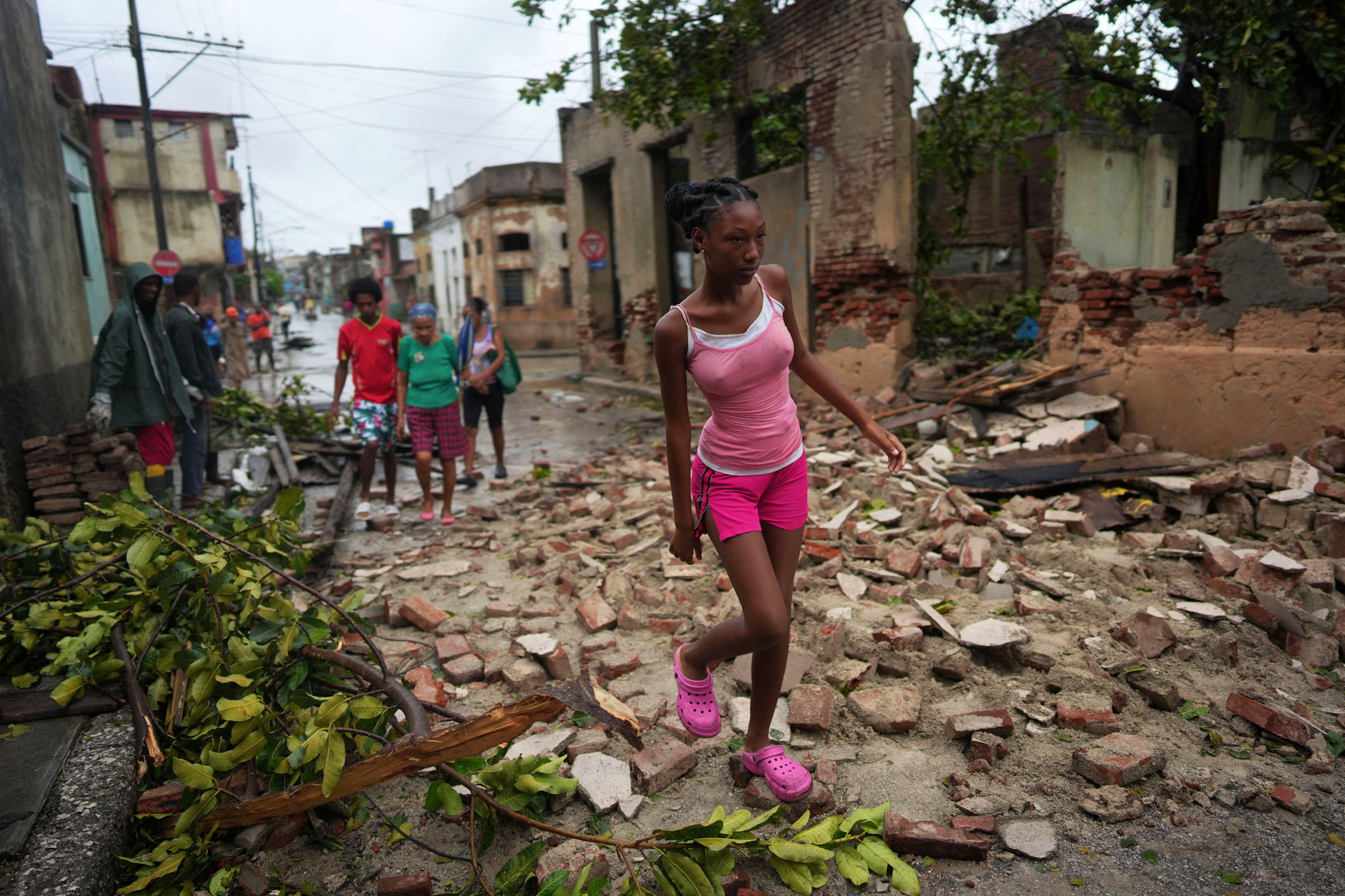People pass by debris from a wall in the aftermath of Hurricane Melissa, in Santiago, Cuba, on October 29, 2025. (Photo by Alexandre Meneghini/Reuters)