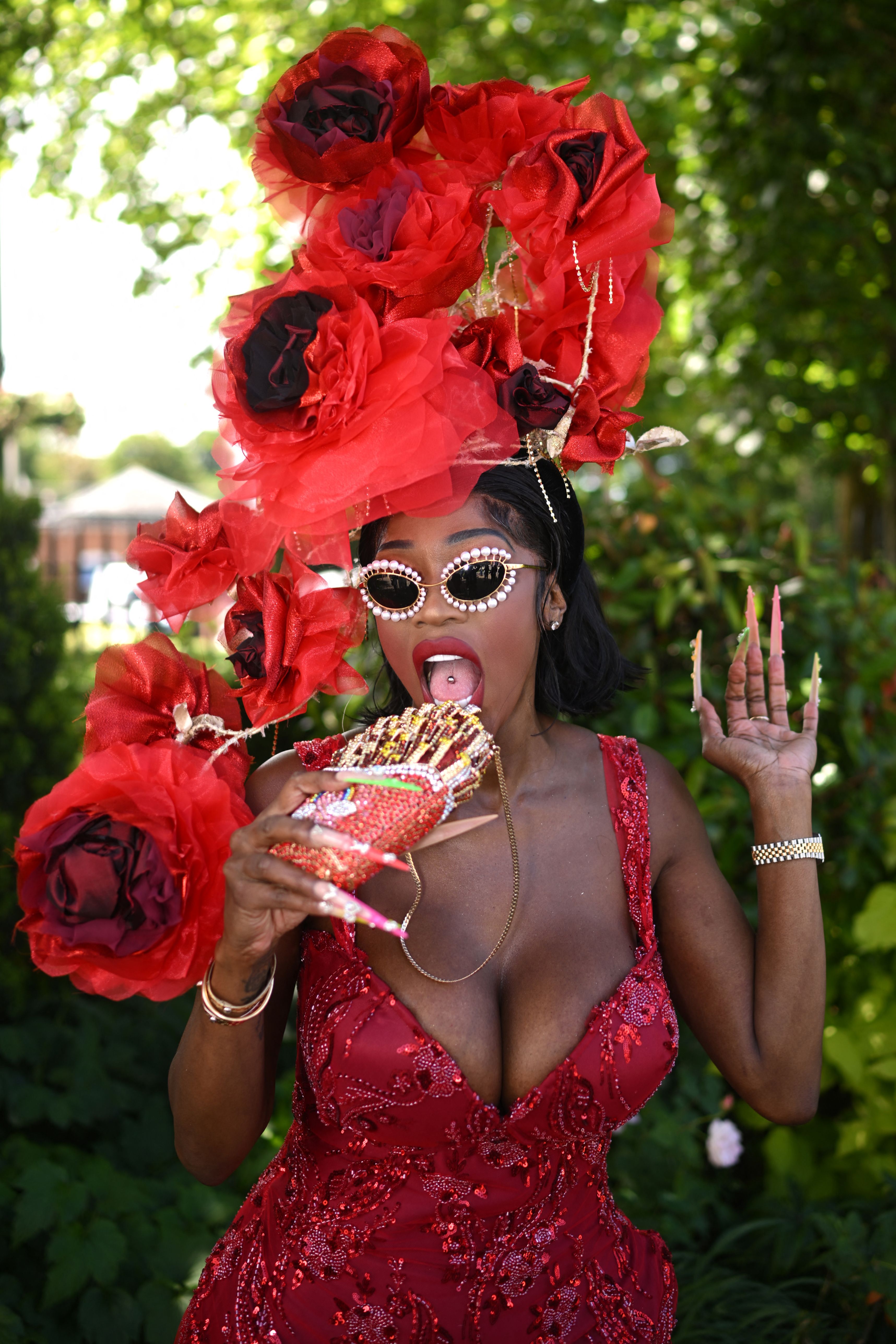 A racegoer poses on the third day of the Royal Ascot horse racing meeting, in Ascot, west of London, on June 20, 2024. (Photo by Justin Tallis/AFP Photo)