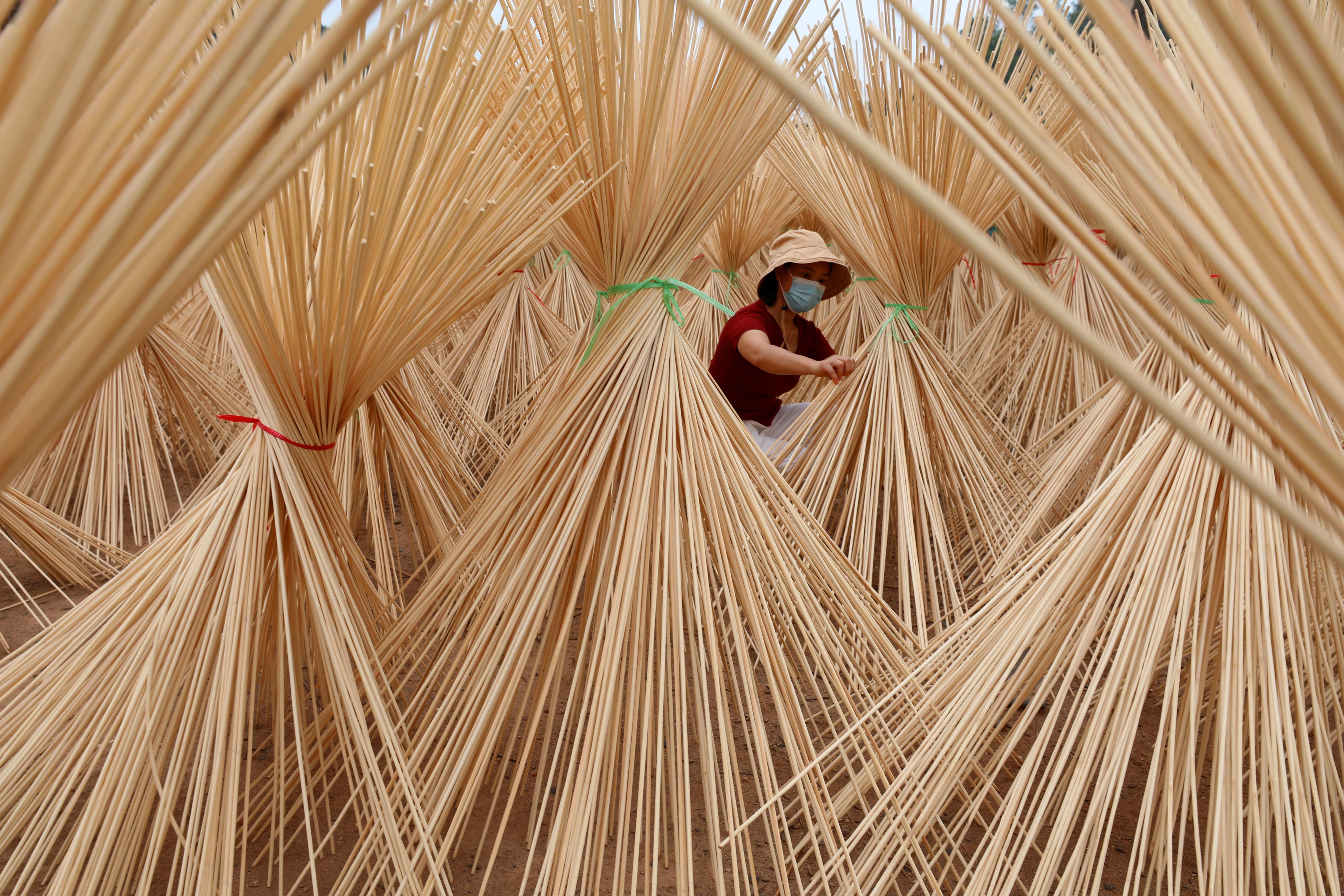 A farmer dries moso bamboo sticks at a bamboo product processing factory on October 18, 2025 in Ji'an, Jiangxi Province of China. (Photo by Deng Heping/VCG via Getty Images)