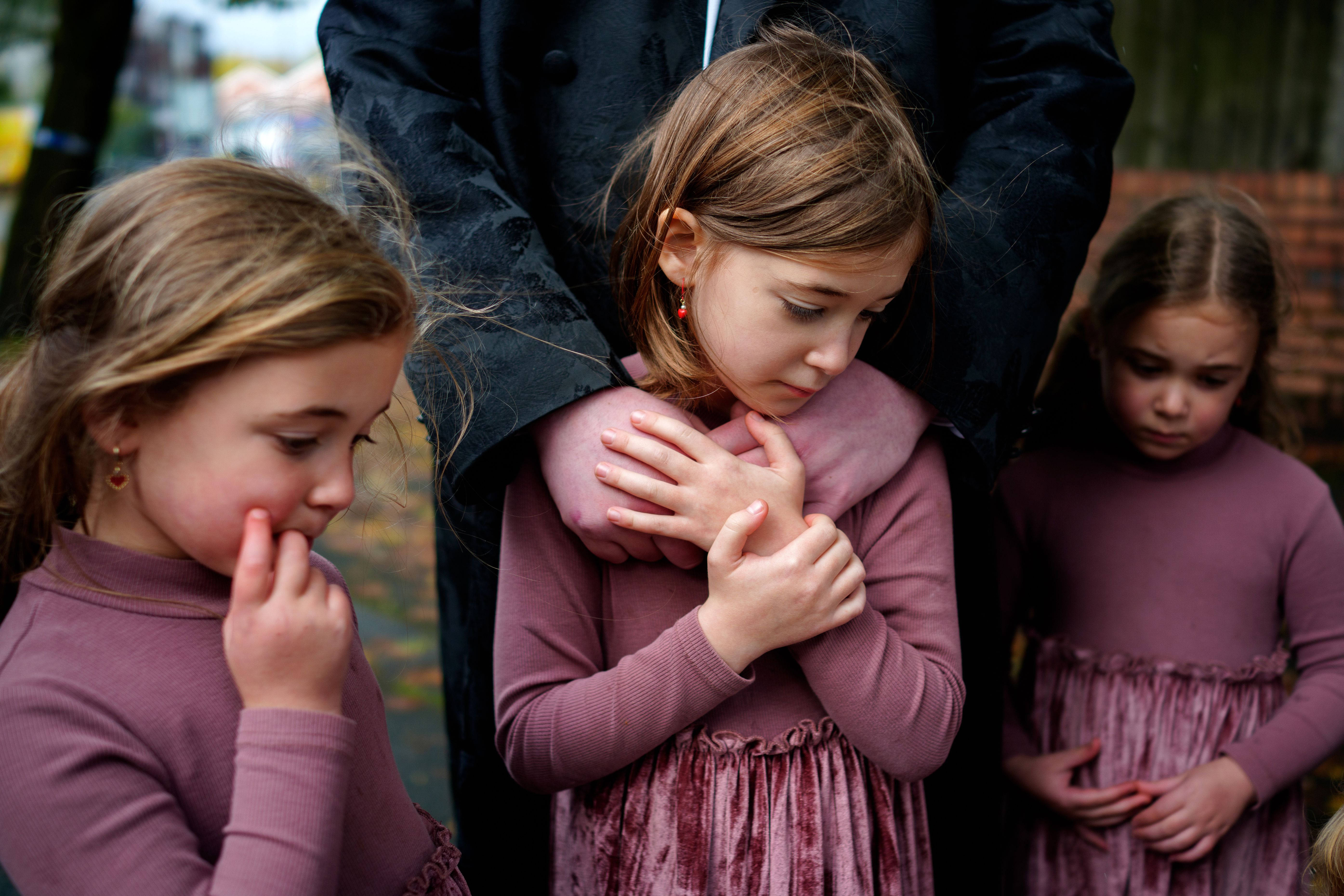 A local family pay their respects and view floral tributes at the scene of Thursday's terror attack at the Heaton Park Hebrew Congregation Synagogue on October 04, 2025 in Manchester, England. On Thursday morning a stabbing and car attack on the Heaton Park Hebrew Congregation Synagogue in the Manchester suburb of Crumpsall left two people dead and four others hospitalized. The attack took place on Yom Kippur, the holiest day of the Jewish calendar, and was declared a terrorist incident by police. The suspected attacker was shot dead by police at the scene. (Photo by Christopher Furlong/Getty Images)