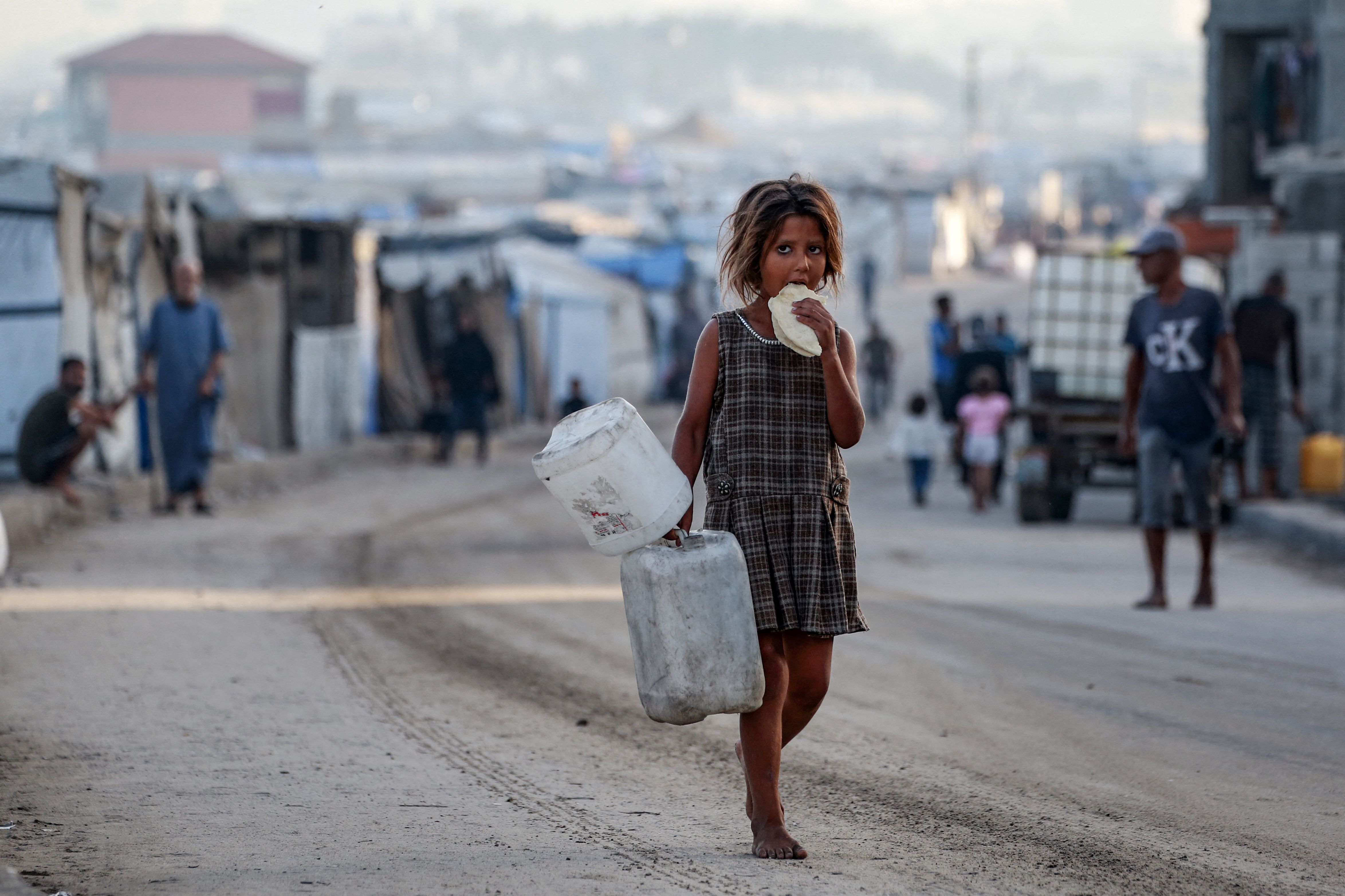 A displaced Palestinian girl eats bread as she walks barefoot carrying empty gallons, along a street in Deir el-Balah in the central Gaza Strip, on October 5, 2025. Negotiators were converging on Cairo on October 5 ahead of talks aimed at ending nearly two years of war in Gaza, with Israel's leader expressing hope that the hostages still being held there would be released in a matter of days. (Photo by Bashar Taleb/AFP Photo)