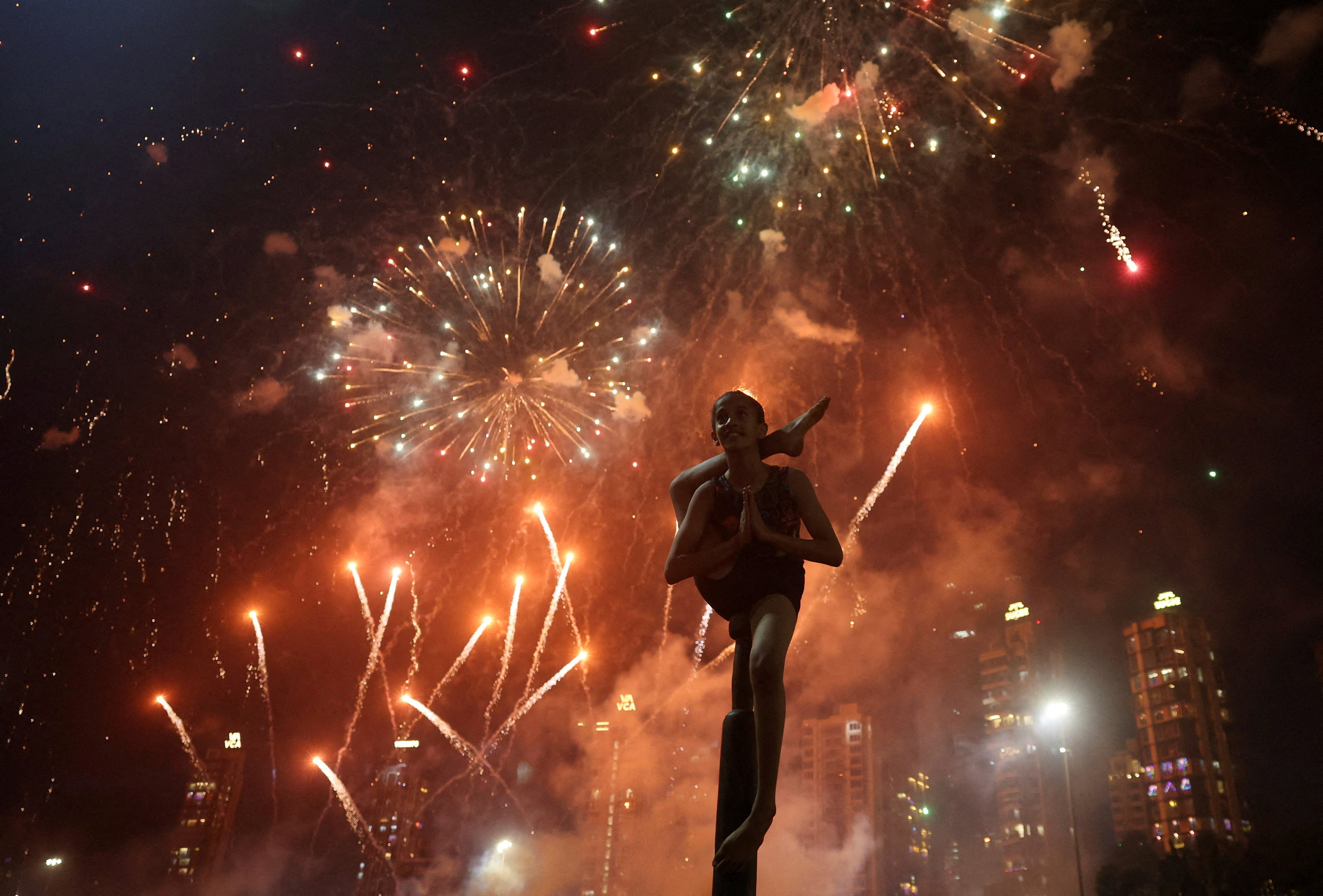 A girl performs mallakhamb, a traditional Indian sport, as fireworks illuminate the sky during Diwali, the Hindu festival of lights, in Mumbai, India, on October 22, 2025. (Photo by Francis Mascarenhas/Reuters)