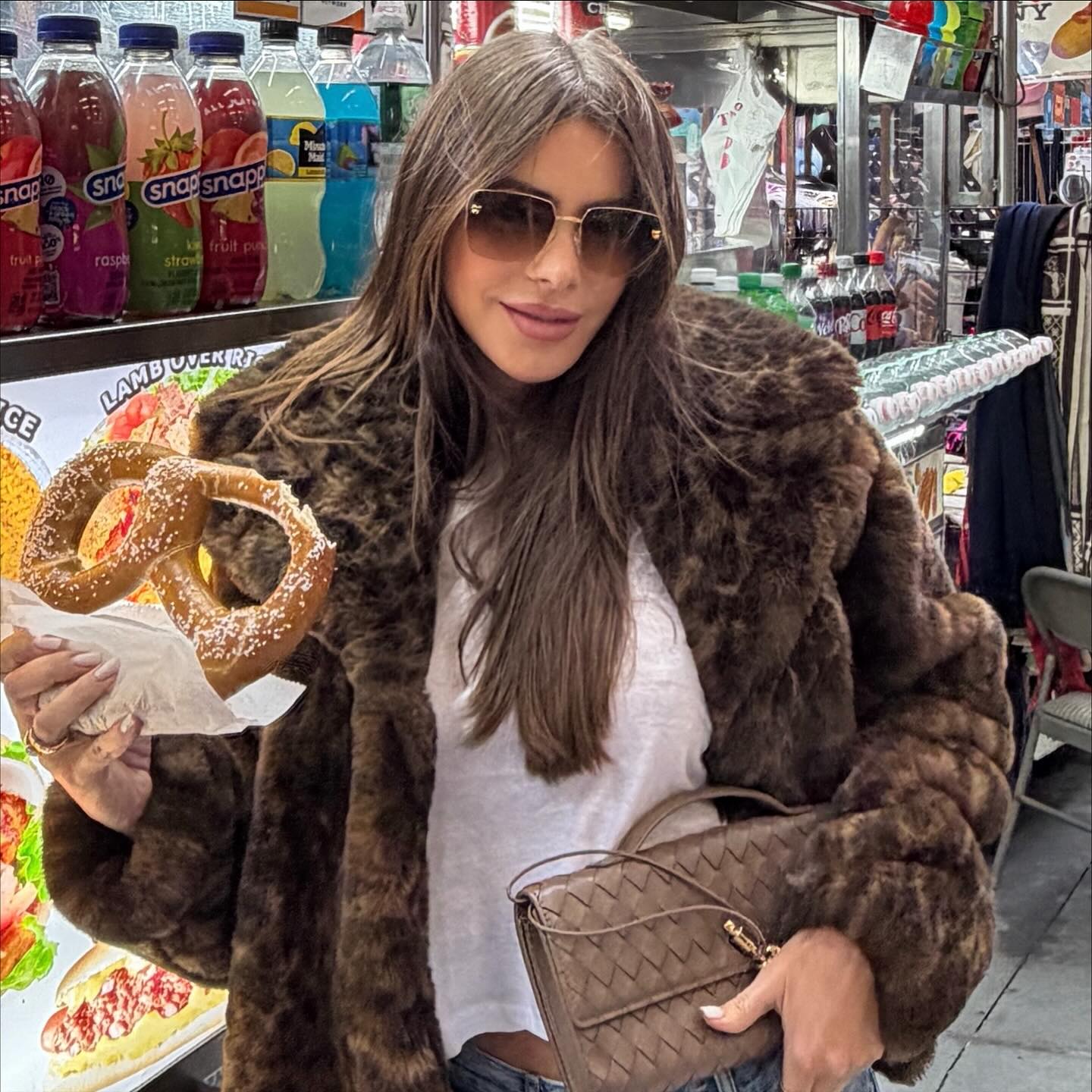 Colombian-American actress Sofía Vergara on October 20, 2025 keeps cozy in a Sofia jacket while snacking on a pretzel. (Photo by sofiavergara/Instagram)