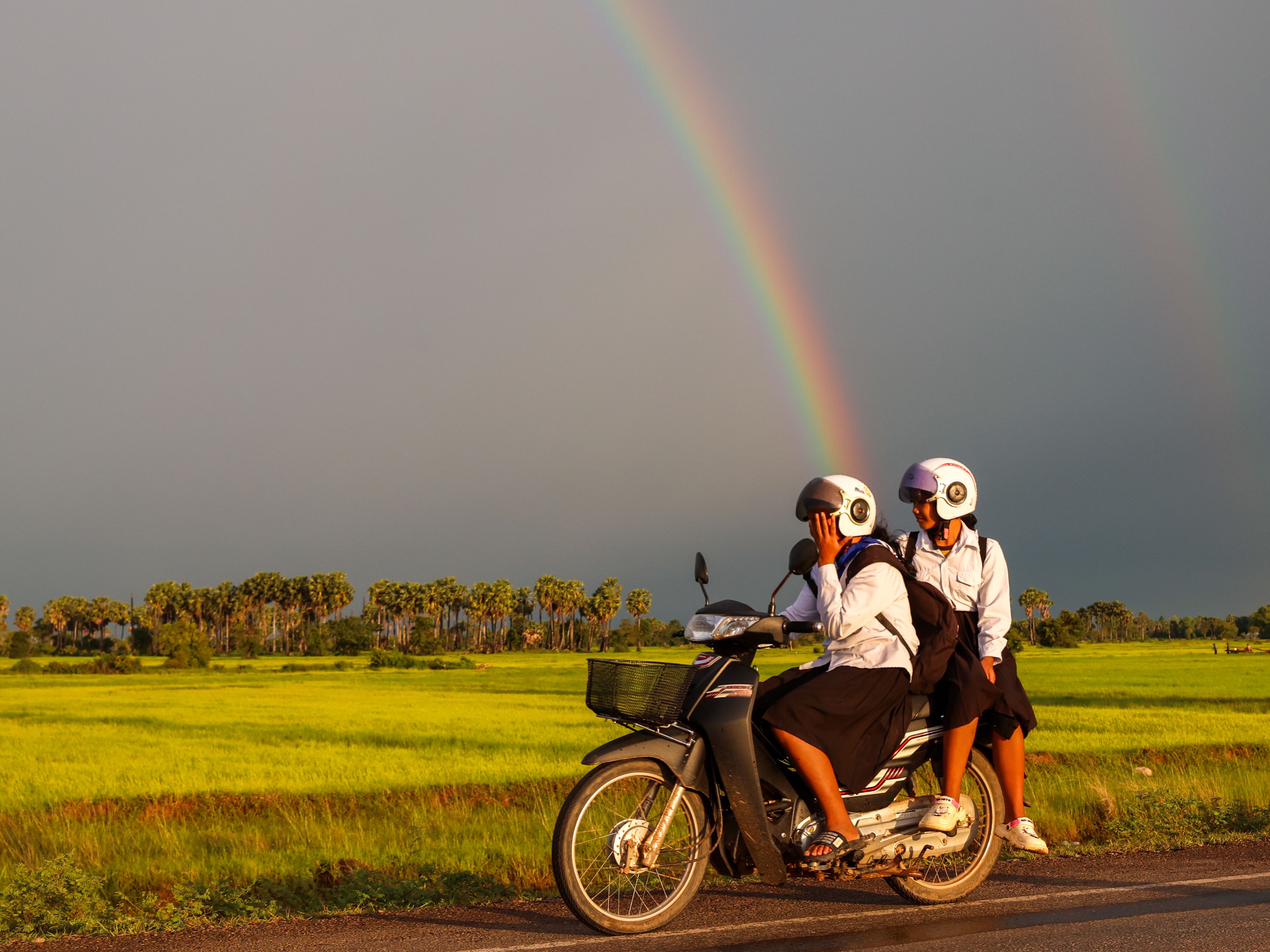 Cambodian motorcyclists drive near a double rainbow, following the conclusion of a ceasefire deal between Cambodia and Thailand, in Siem Reap, Cambodia, on July 29, 2025. (Photo by Daniel Ceng/Anadolu via Getty Images)