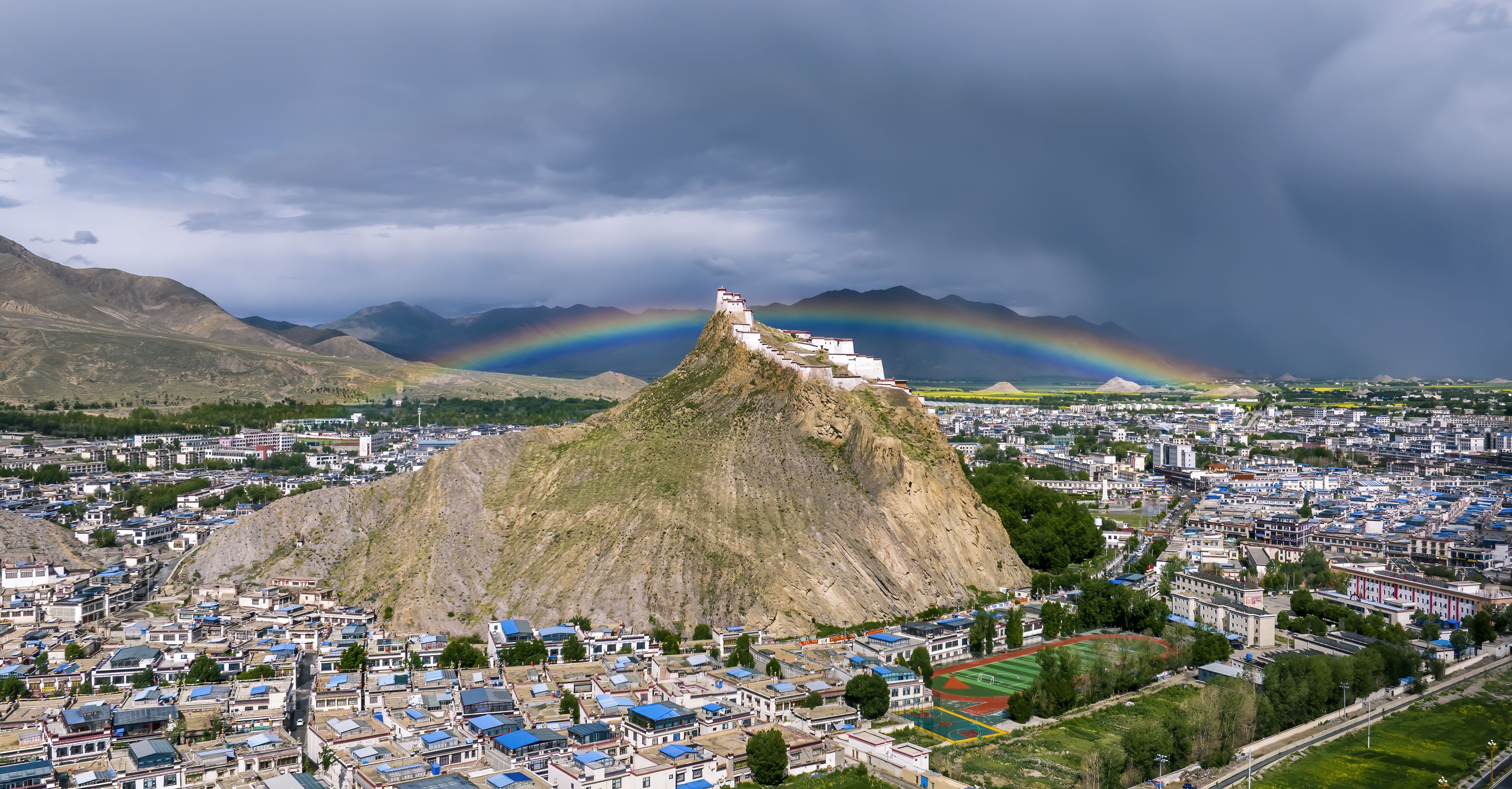 Aerial view of rainbow appearing over Jiangzi Zongshan Castle on July 1, 2025 in Shigatse, Xizang Autonomous Region of China. (Photo by VCG/VCG via Getty Images)