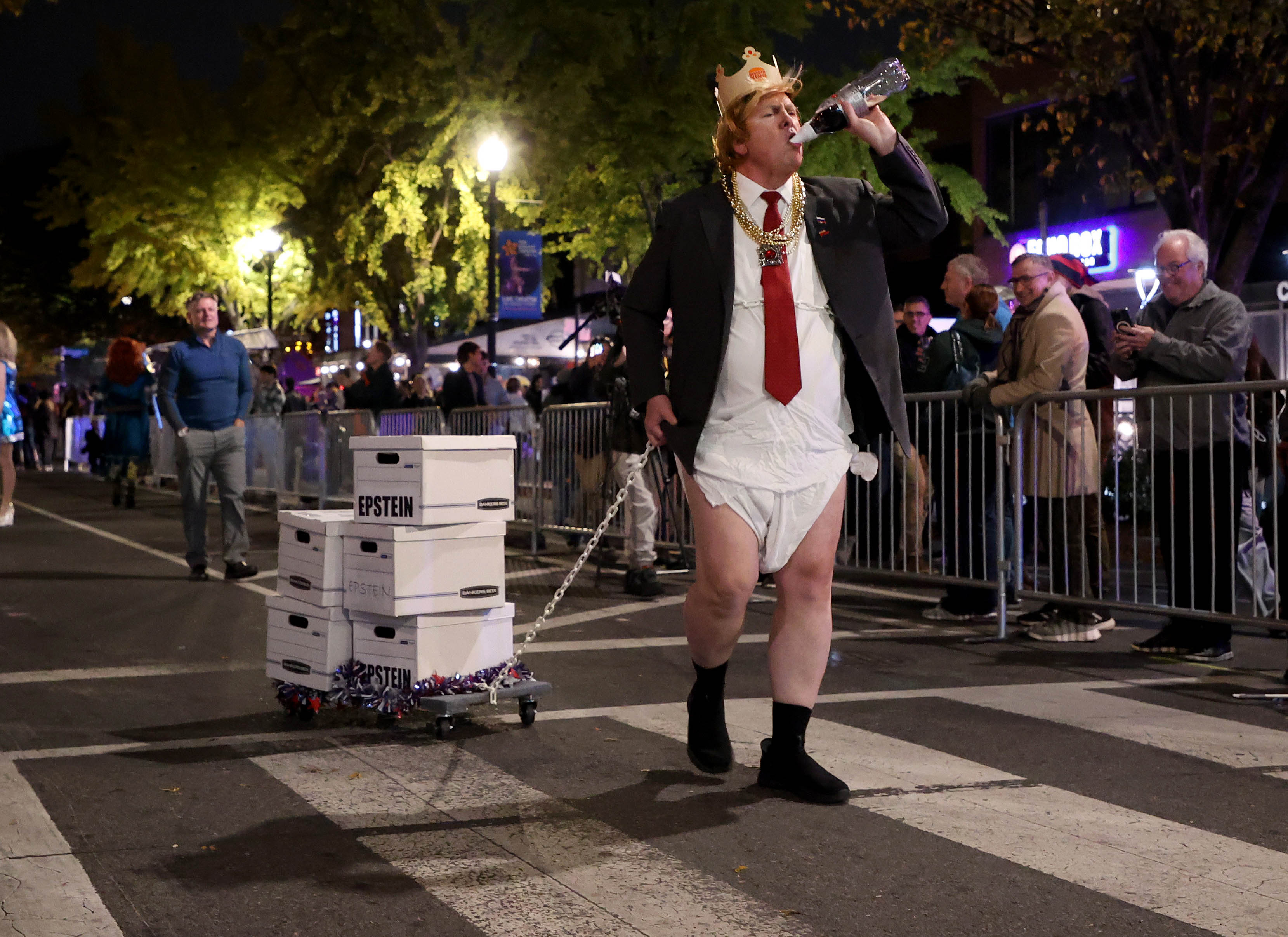 A participant mimicking the US President Donald Trump.take part in the 38th Annual 17th Street High Heel Race in the Dupont Circle neighbourhood of Washington, DC, USA, on October 28, 2025. Since 1986, costumed drag queens and others in the LGBTQ community have participated in the race held on the Tuesday before Halloween. (Photo by Gent Shkullaku/ZUMA Press Wire/Rex Features/Shutterstock)