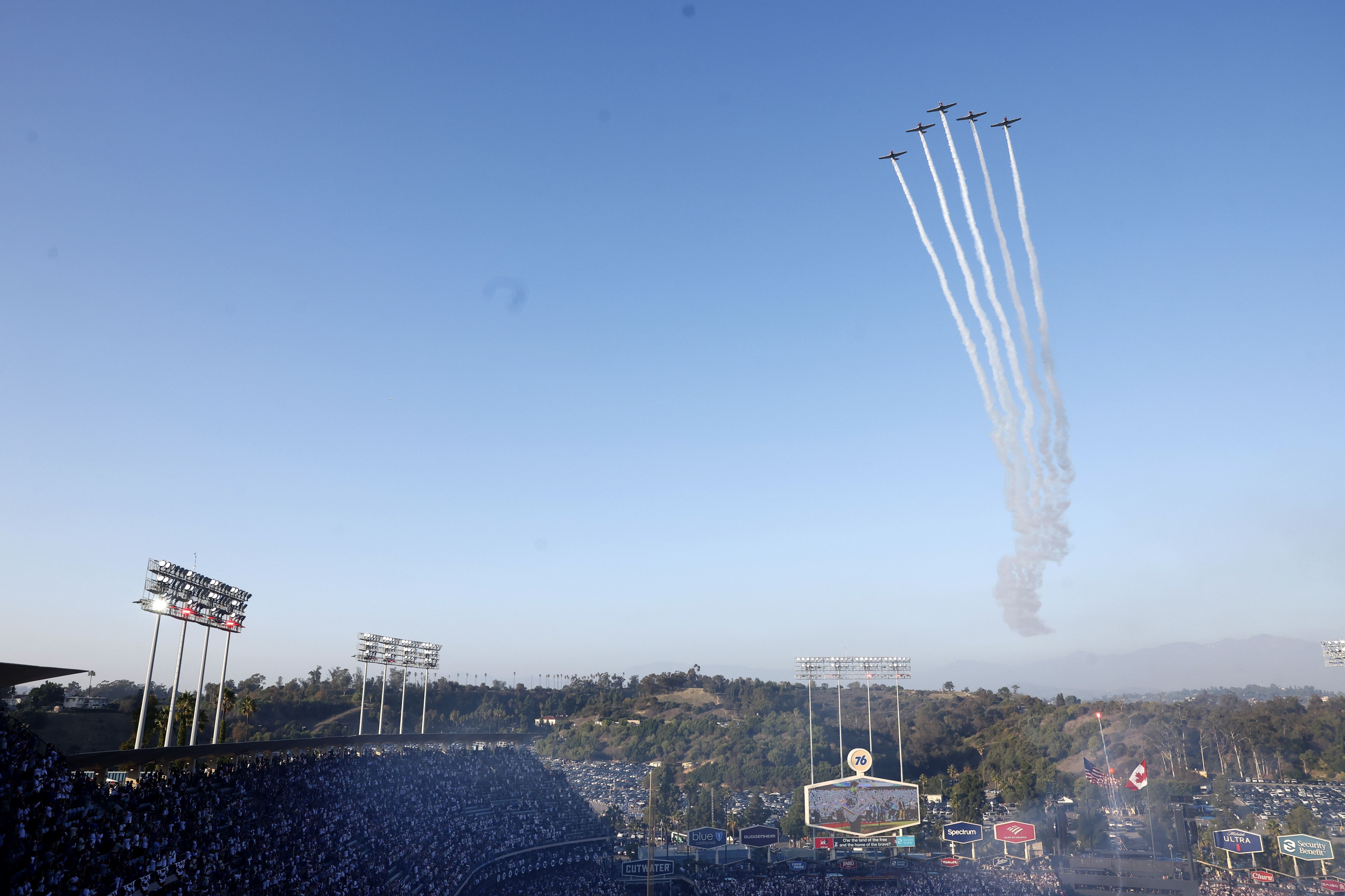 Vintage airplanes fly over the stadium before game three of the MLB World Series between the Toronto Blue Jays and the Los Angeles Dodgers in Los Angeles, California, USA, 27 October 2025. (Photo by Caroline Brehman/EPA)