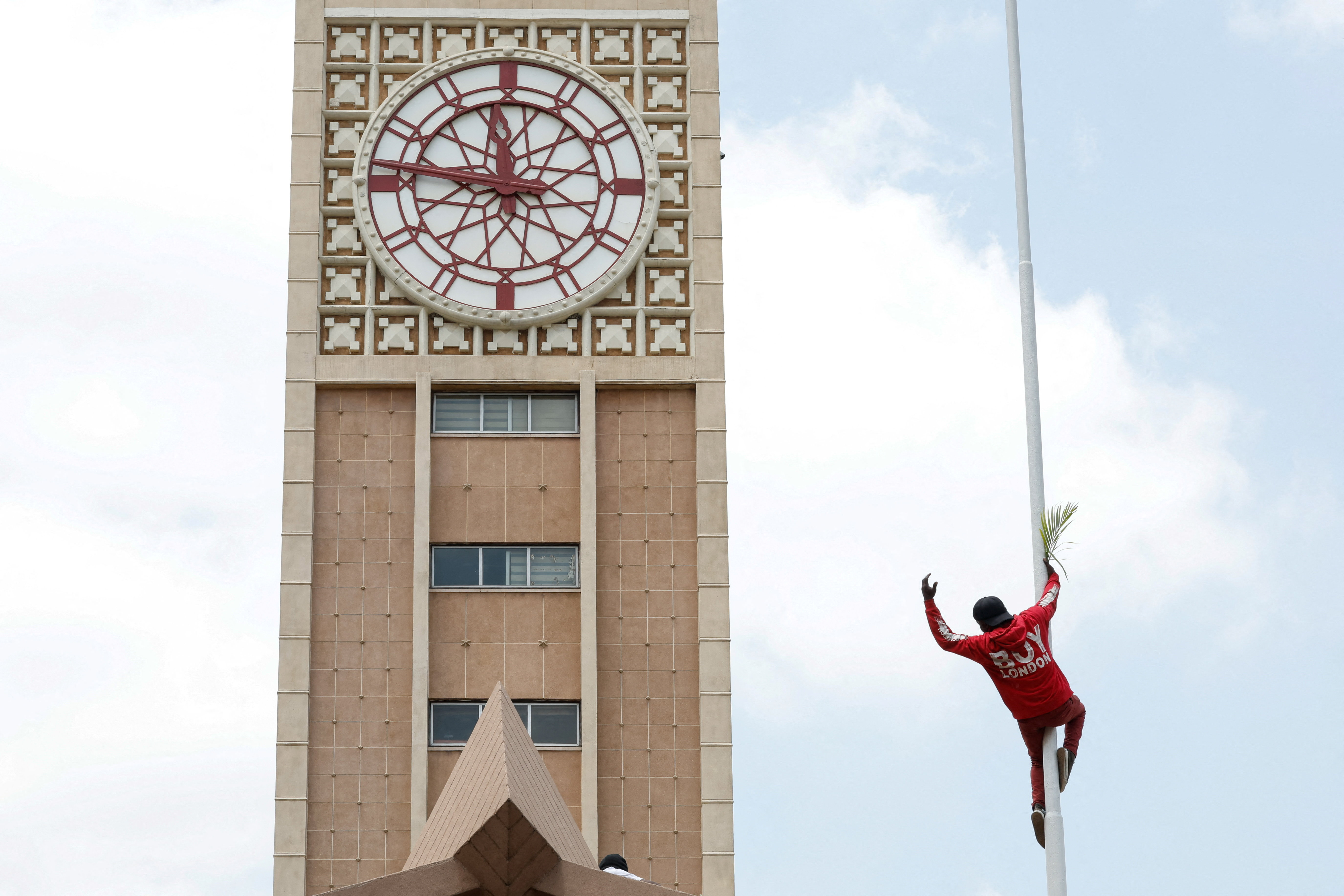 A mourner climbs a pole outside the Parliament building where the body of Kenya’s former Prime Minister Raila Odinga, who had been receiving treatment in India when he died, is expected to be kept for people to pay tribute, in Nairobi, Kenya on October 16, 2025. (Photo by Monicah Mwangi/Reuters)