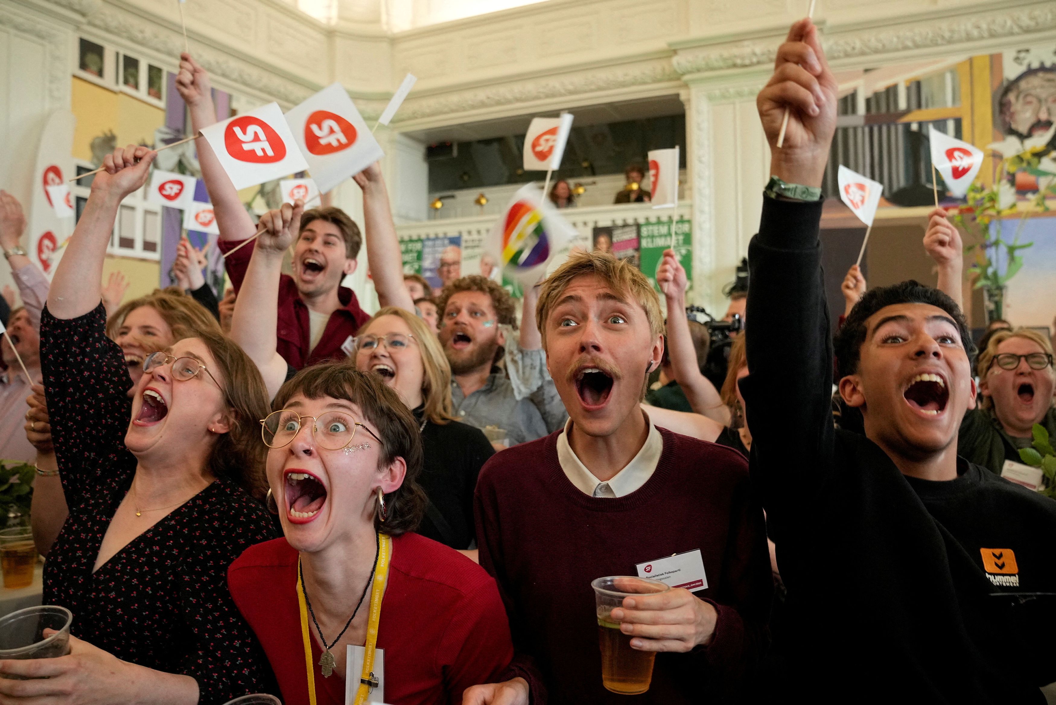 Attendees react to the exit poll during an election party of the Socialist People's Party during the European Parliament elections at Christiansborg in Copenhagen, Denmark, on June 9, 2024. (Photo by Bo Amstrup/Ritzau Scanpix via Reuters)