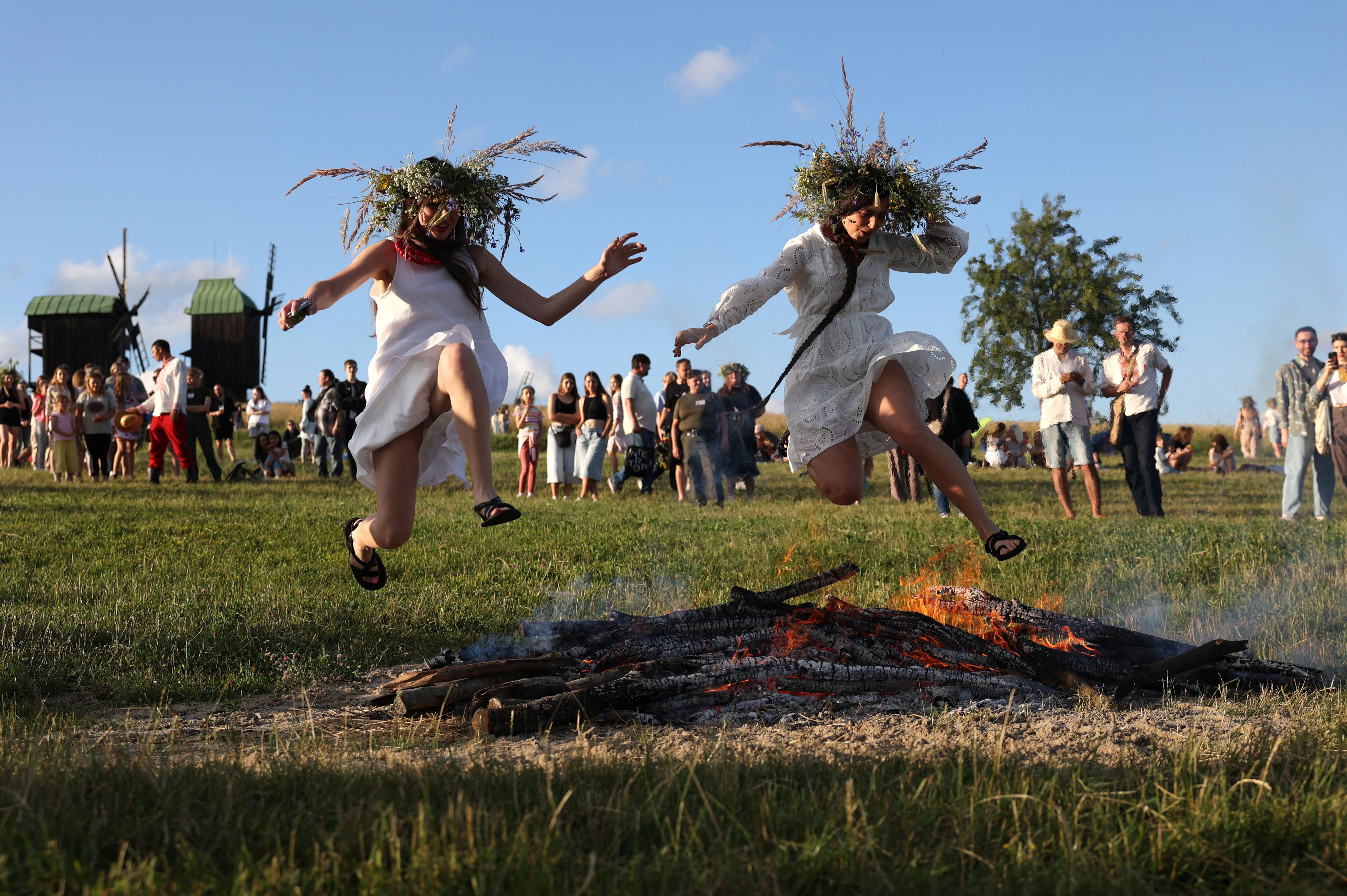 Participants jump over a bonfire as they celebrate the Pagan holiday of Ivan Kupala, a traditional holiday that has been observed in Ukraine since pre-Christian times, in Kyiv, on June 23, 2024, amid the Russian invasion in Ukraine. (Photo by Anatolii Stepanov/AFP Photo)
