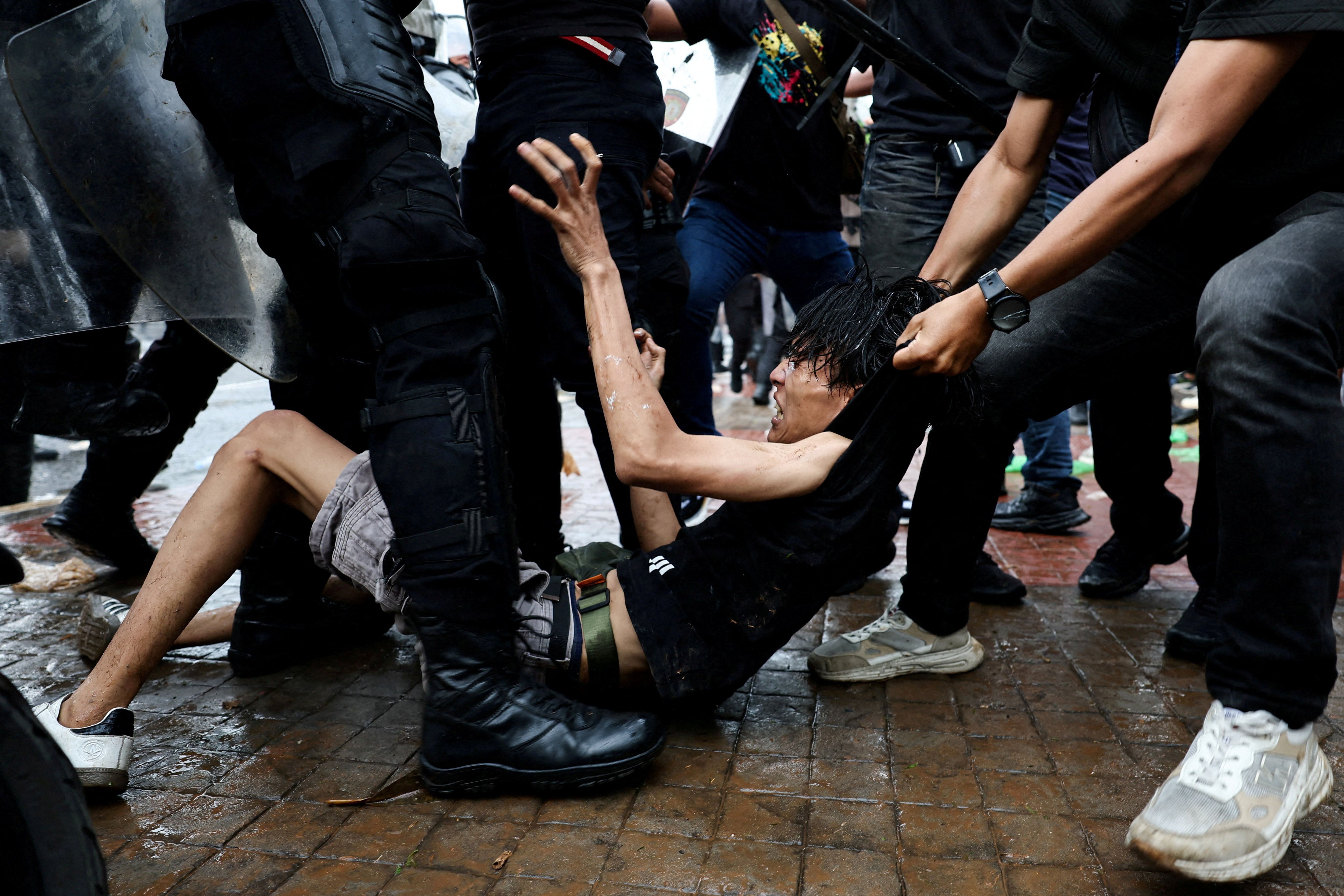 Riot police detain a man during a clash at a protest outside Indonesian parliament buildings, in Jakarta, Indonesia, on August 28, 2025. (Photo by Willy Kurniawan/Reuters)