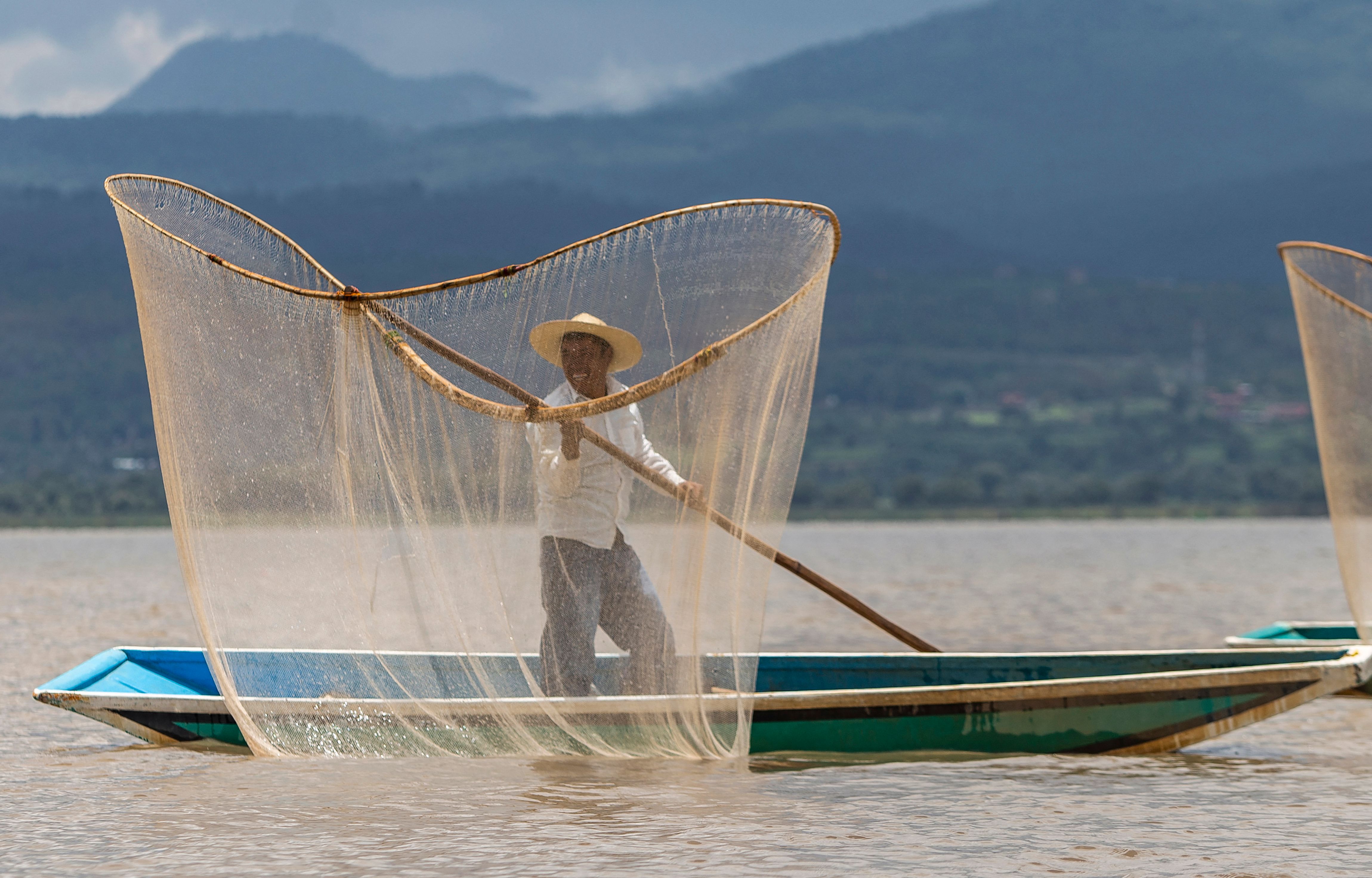A fisherman uses the butterfly net technique to fish near the island of Janitzio in Patzcuaro lake, Michoacan state, Mexico on July 16, 2024. The Patzcuaro municipality works with residents on a program to recover the water level of lake Patzcuaro, seriously affected by drought. (Photo by Enrique Castro/AFP Photo)