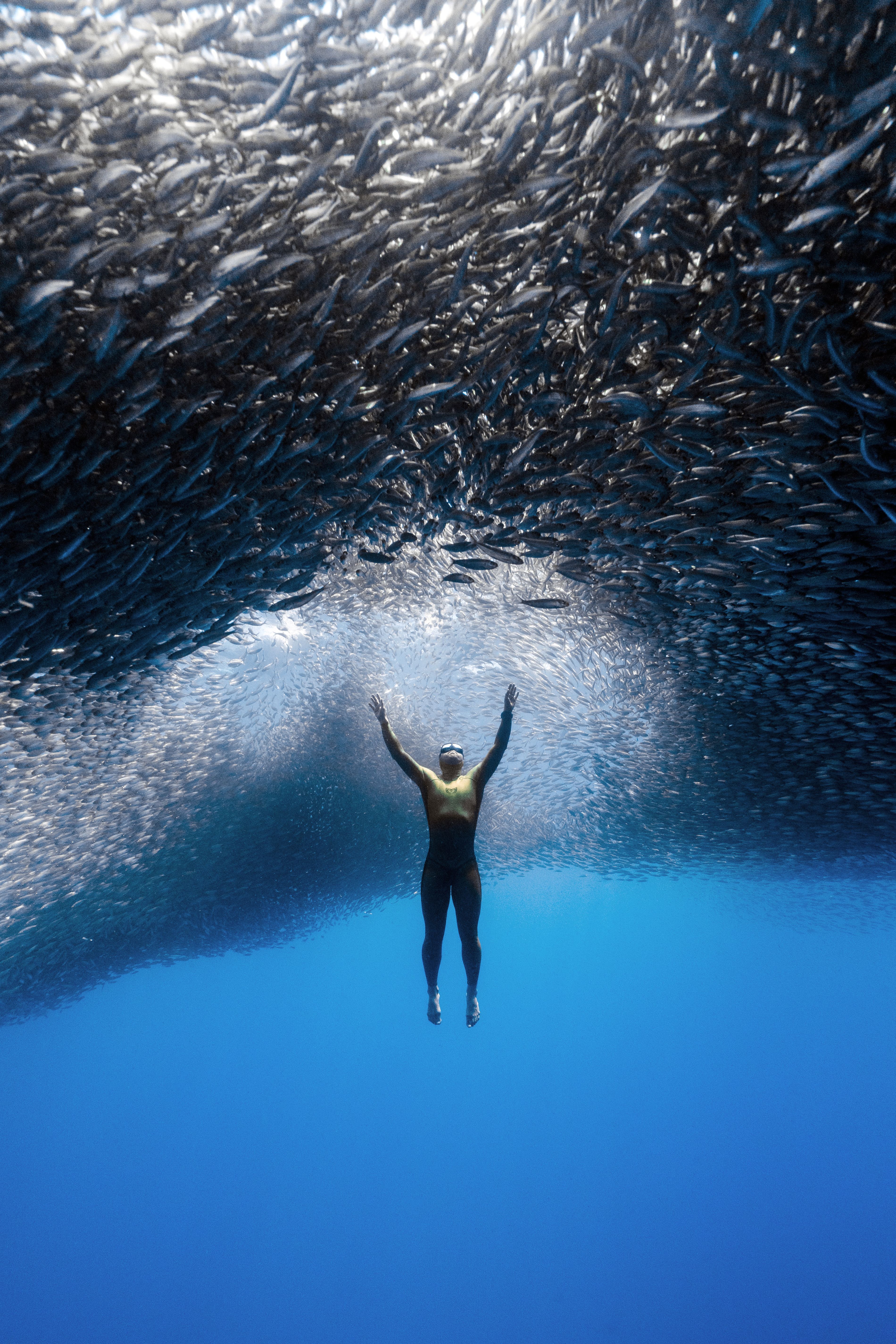 A diver is suspended under a shimmering cloud of sardines off Panglao Island in the Philippines in the first decade of November 2025. (Photo by Ben Yavar/Two Point O Media)