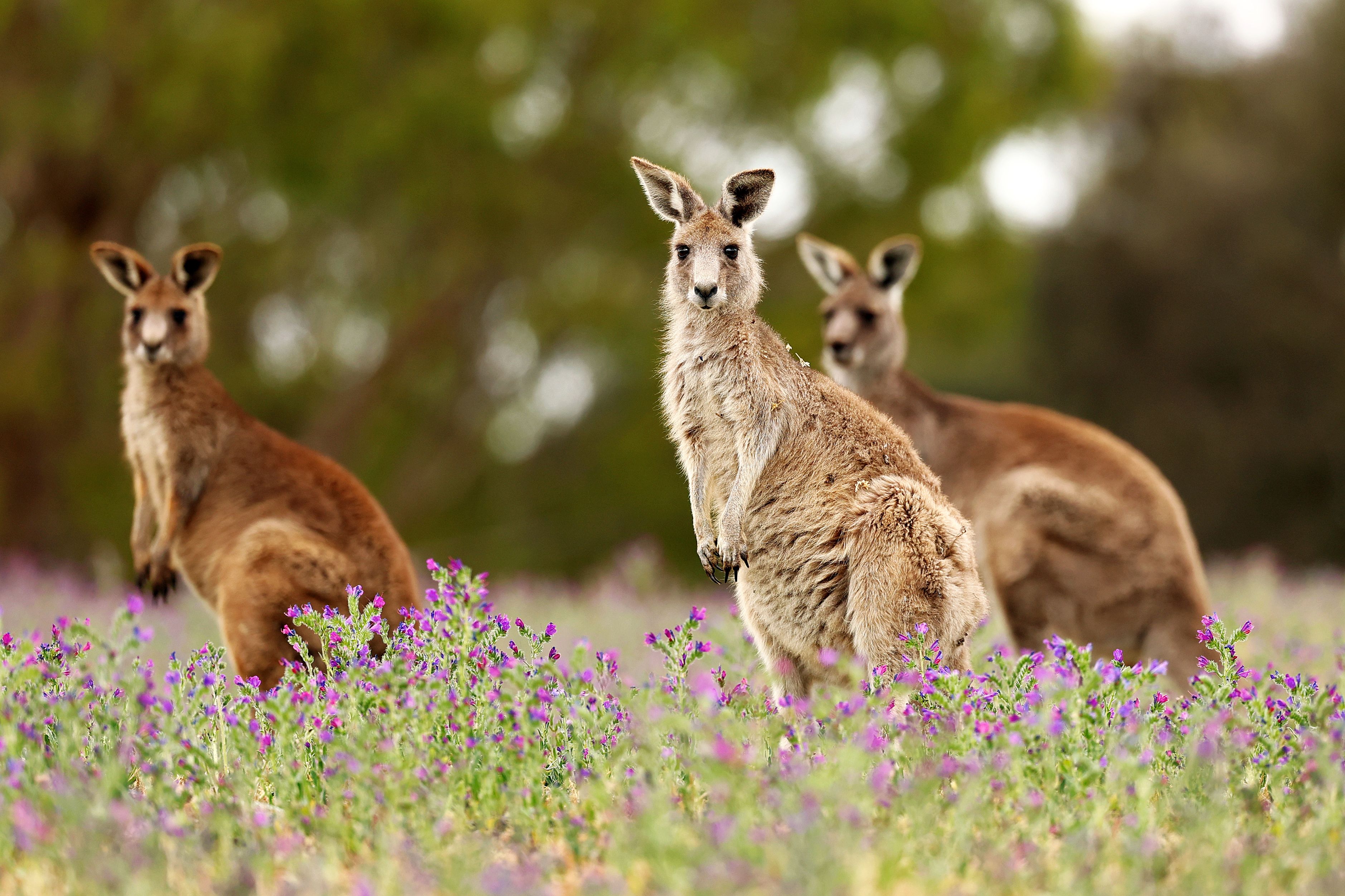 Eastern Grey Kangaroos are seen among Patterson's Curse (Echium plantagineum), which blooms during Spring on October 24, 2025 in Melbourne, Australia. (Photo by Morgan Hancock/Getty Images)