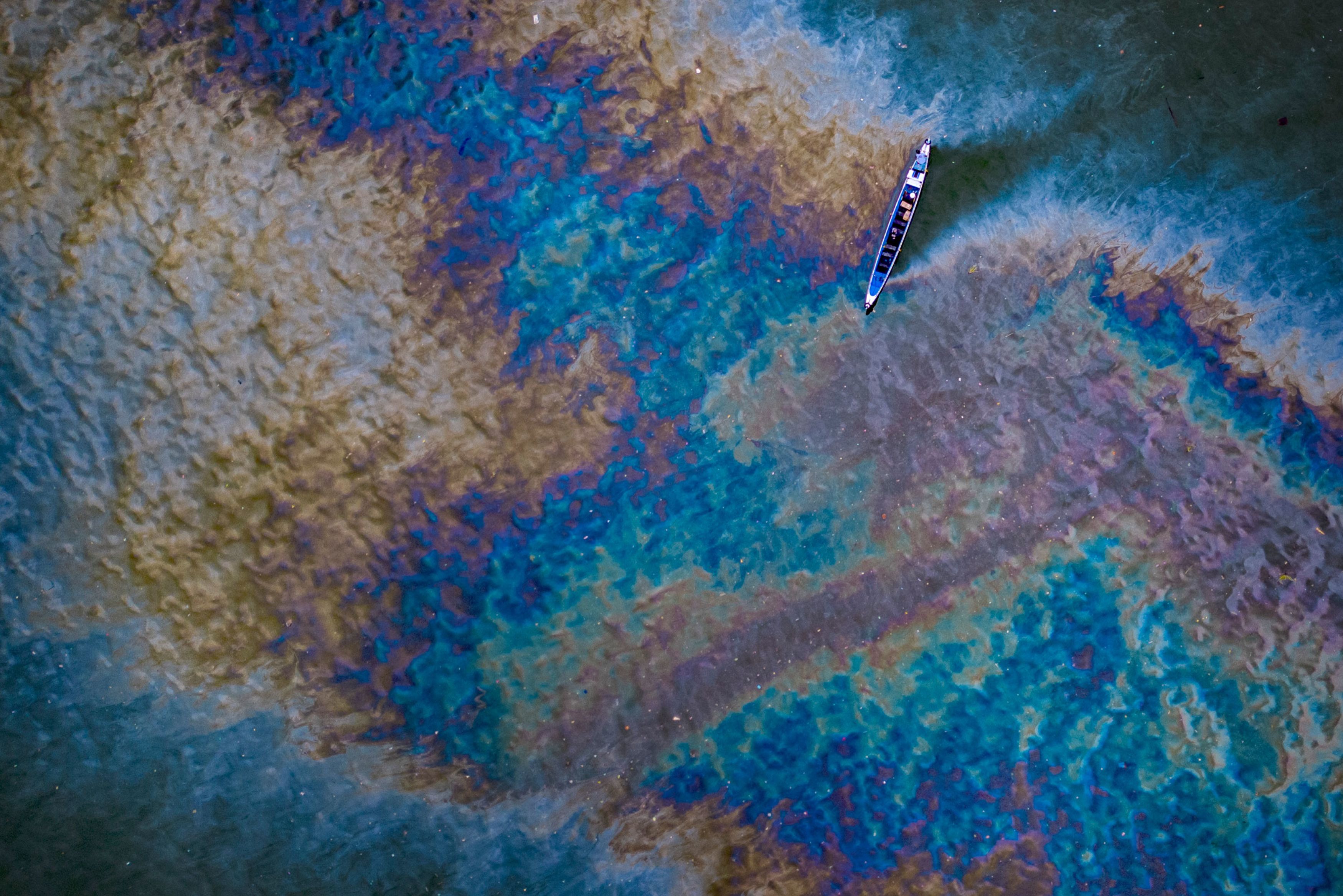This aerial photo, taken on Monday, July 29, 2024 shows an oil slick from the MT Terra Nova, which capsized in the waters of Manila Bay near the coastal village of Santa Cruz, Philippines. The oil tanker capsized during strong winds and high waves caused by Typhoon Gaemi, Philippine authorities said. (Photo by Ezra Acayan/Getty Images)