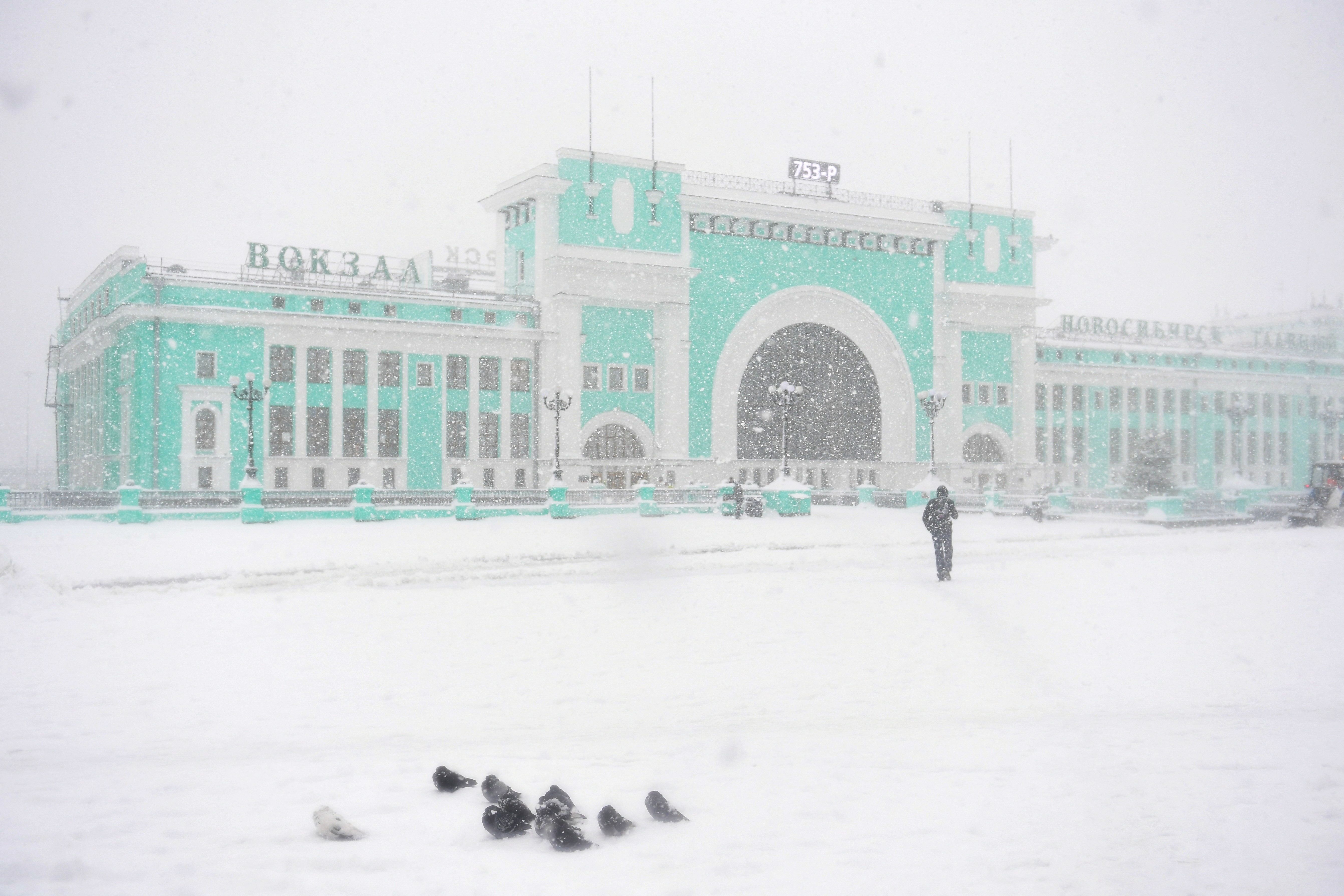 A person walks near the railway station during heavy snowfall in Novosibirsk, Russia on October 9, 2025. (Photo by Vladislav Nekrasov/Reuters)