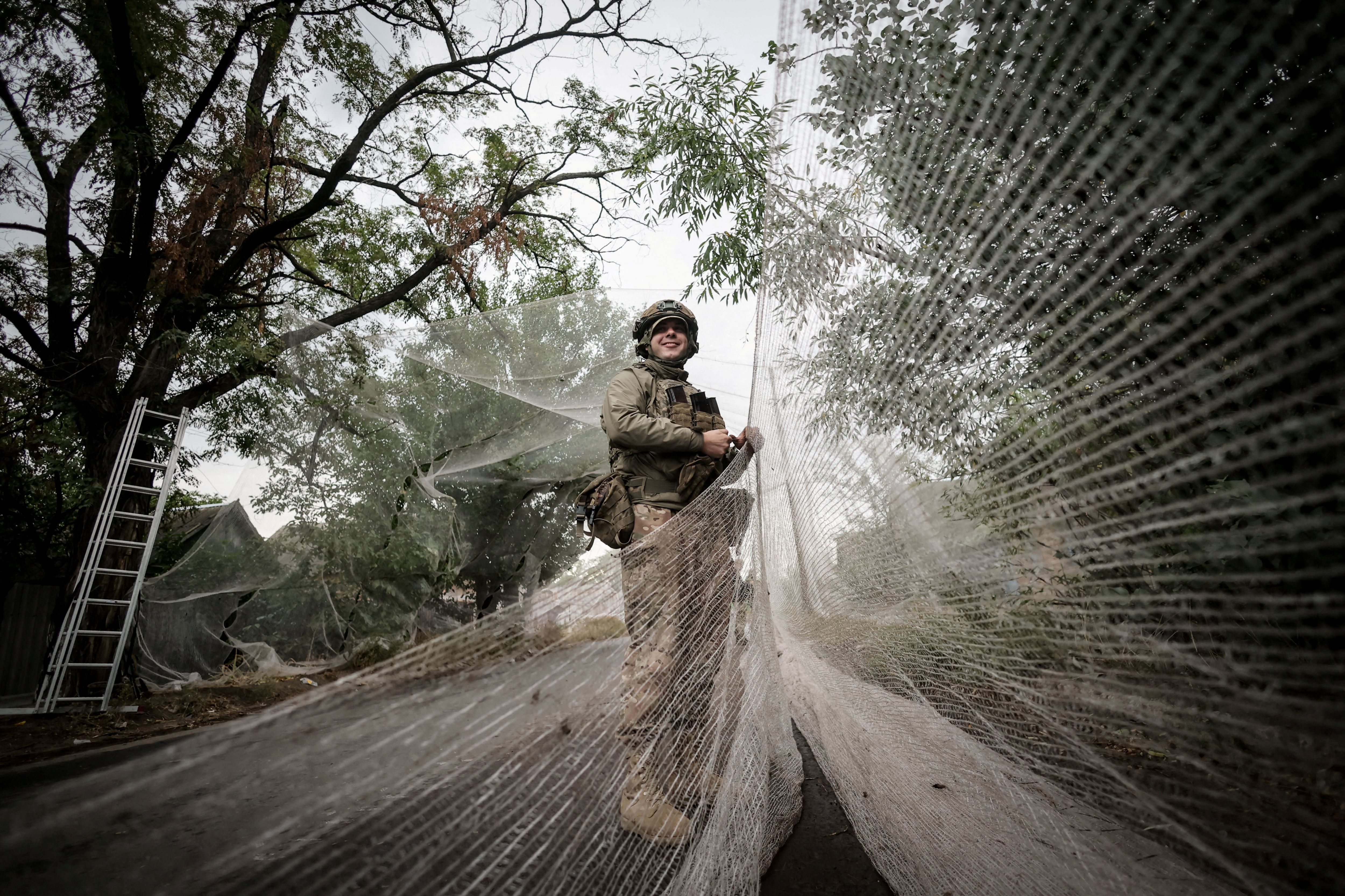 A member of the Ukrainian armed forces installs anti-drone nets over a road in the Donetsk region on October 14, 2025. (Photo by Ukrainian Armed Forces/Reuters)