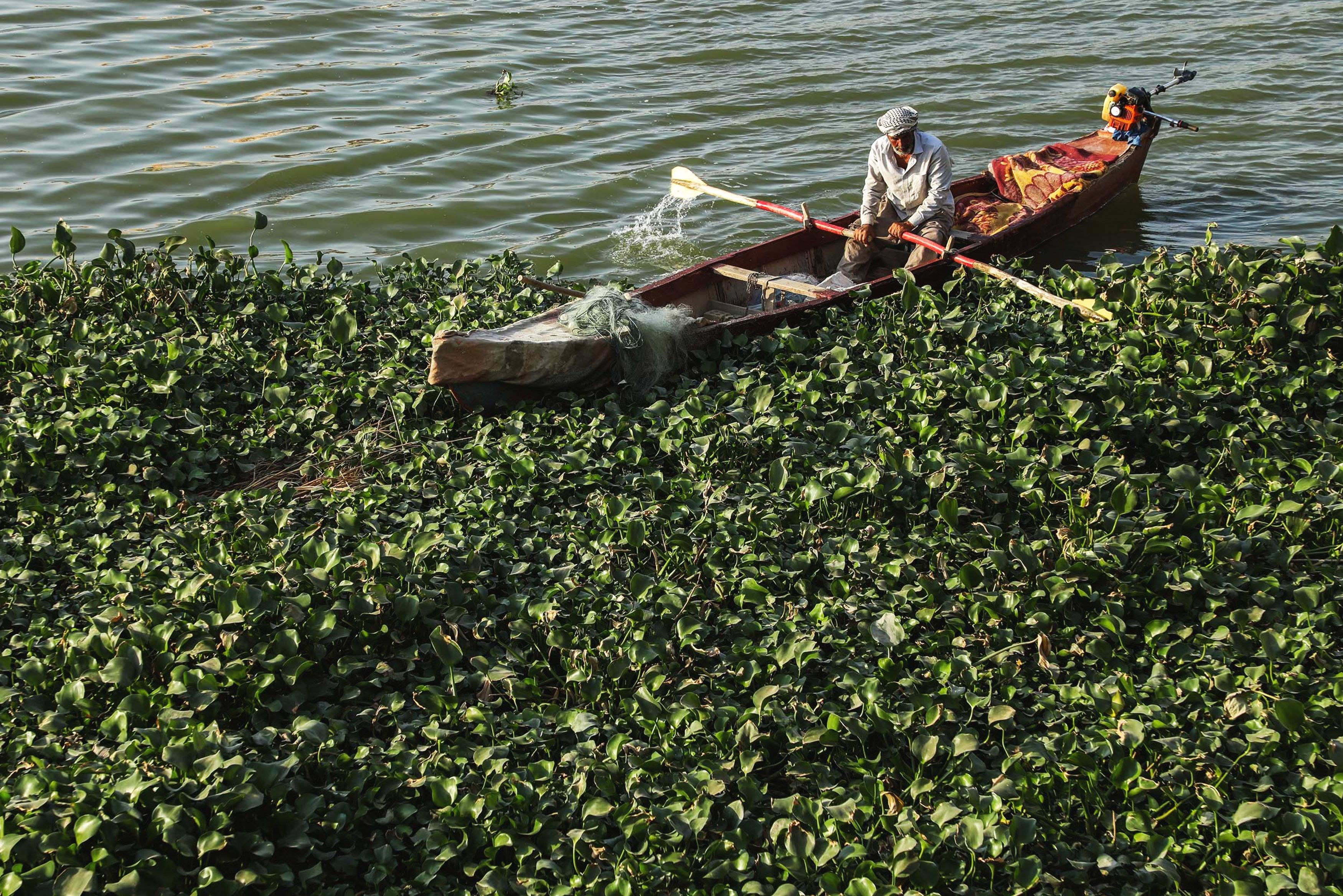A fisherman sits in his boat near swathes of water hyacinth, a water-consuming invasive bloom, in Nasiriyah, Iraq, on Tuesday, September 9, 2025. Iraq's Euphrates River is running at historically low levels as the drought-stricken country faces its worst water scarcity in living memory. (Photo by Asaad Niazi/AFP Photo)