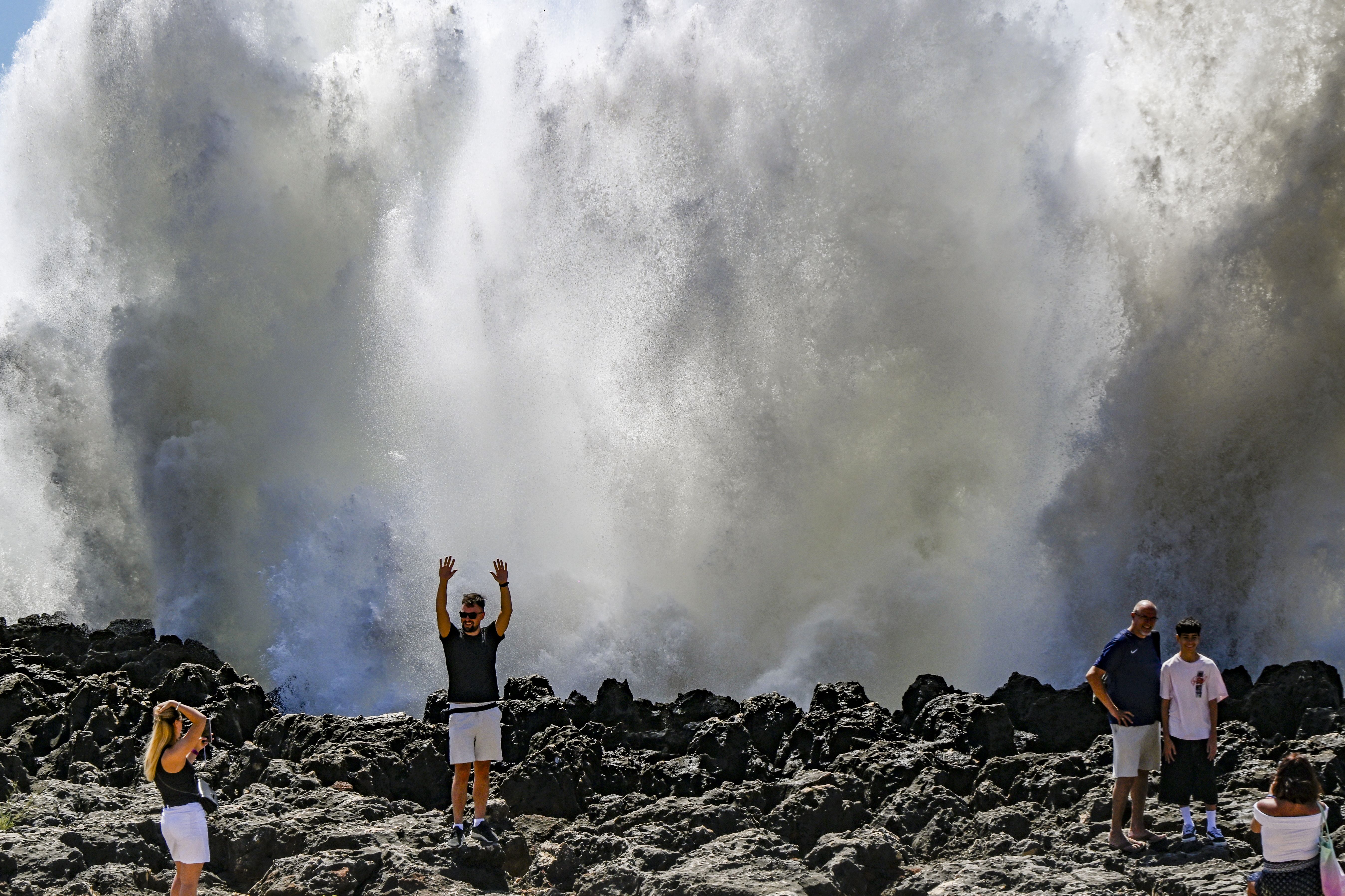 Tourists stand selfing as large waves crash against the cliff in Boca do Inferno on August 26, 2025, in Cascais, Portugal. Six sea coastal areas are closed to navigation today due to strong sea turbulence, which has led the Portuguese Sea and Atmosphere Institute (IPMA) to issue a yellow warning for 10 districts in mainland Portugal. The districts of Porto, Faro, Set�bal, Viana do Castelo, Lisbon, Leiria, Beja, Aveiro, Coimbra and Braga have been under a yellow warning since 6am Tuesday until 6am on Wednesday. (Photo by Horacio Villalobos#Corbis/Corbis via Getty Images)