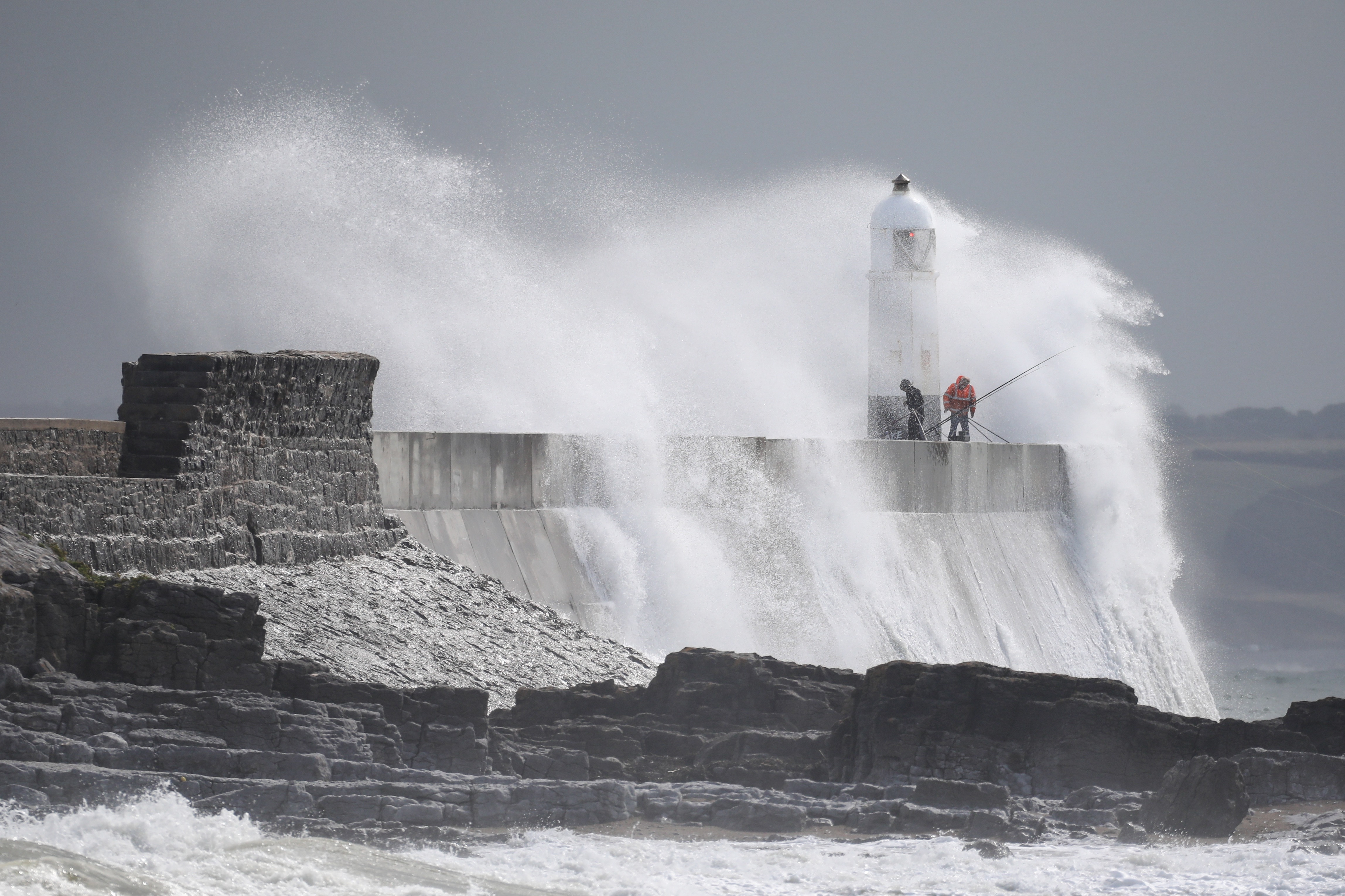 Fishermen brave stormy seas as large waves crash over them at Porthcawl in Wales, UK on August 31, 2025. Britain is seeing unsettled weather as the remnants of Tropical Storm Fernand and Hurricane Erin bring wind and rain. (Photo by Joann Randles/Cover Images)