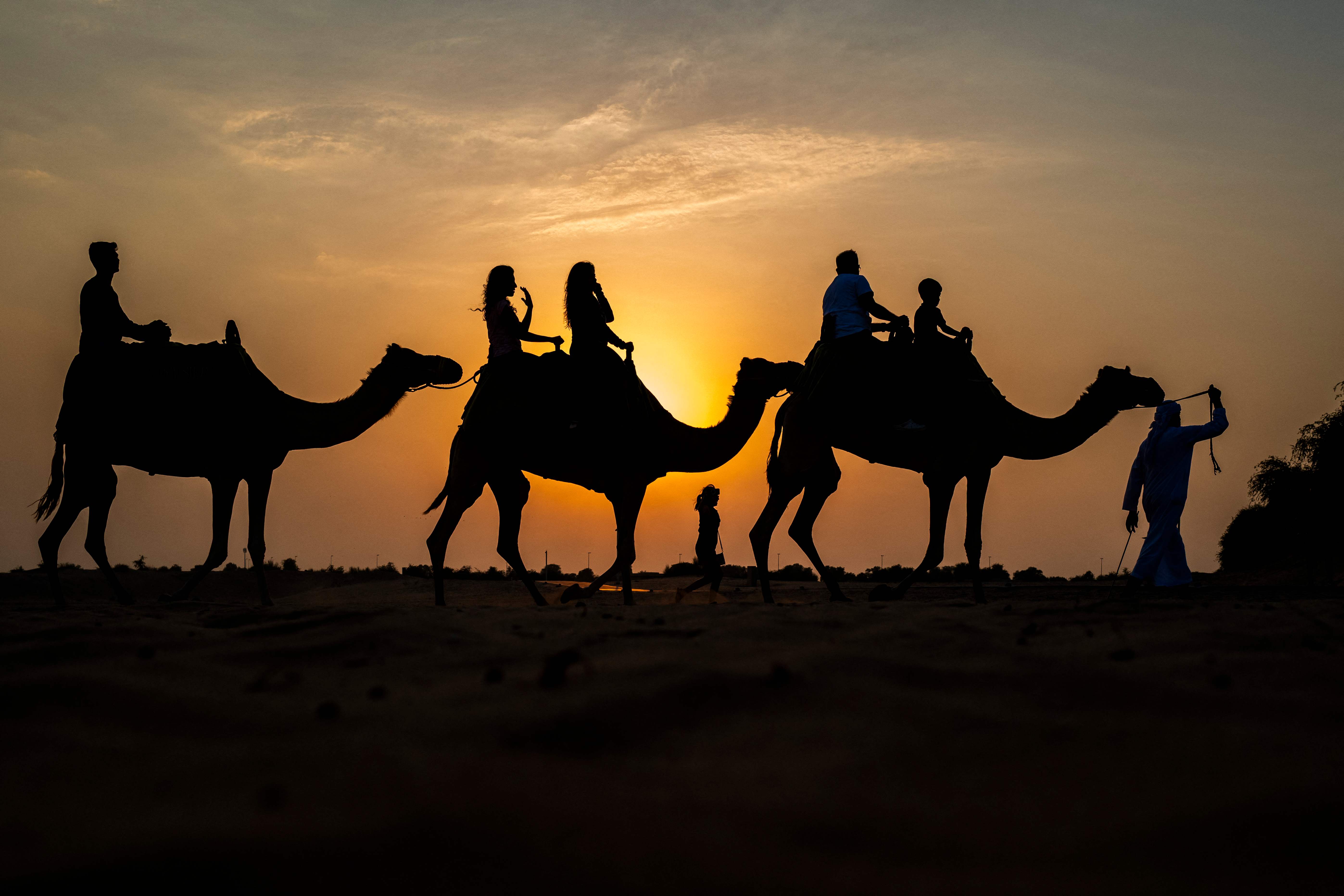 Tourists ride camels at a desert resort in Dubai at sunset on October 19, 2025. (Photo by Jewel Samad/AFP Photo)