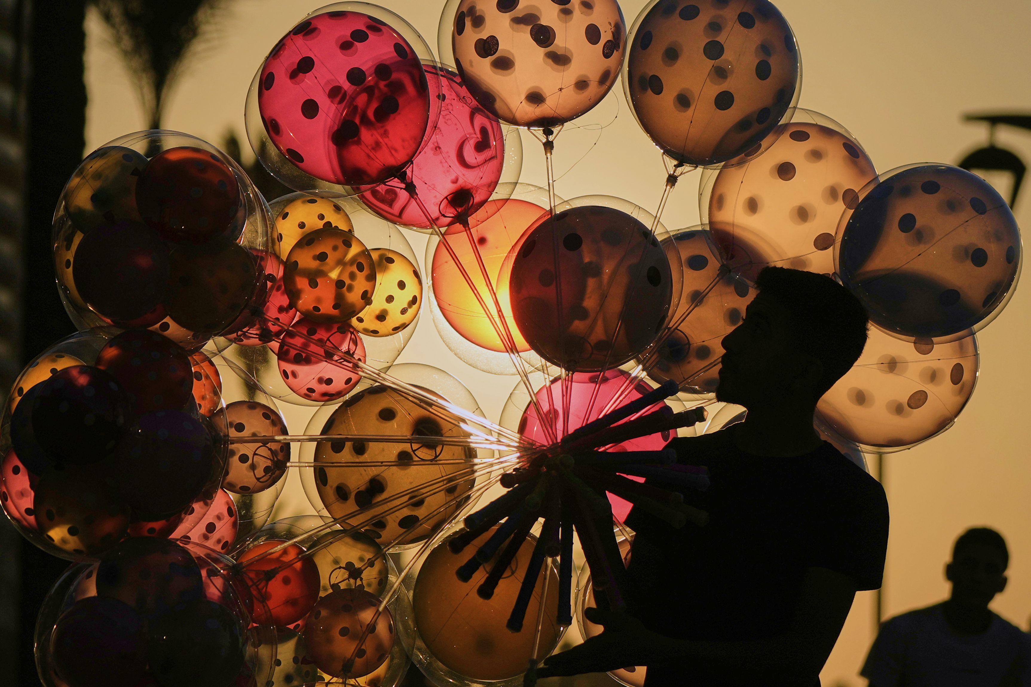 A Syrian boy sells balloons as the sun sets over the Mediterranean waterfront promenade in Beirut, Lebanon, Saturday, August 23, 2025. (Photo by Bilal Hussein/AP Photo)