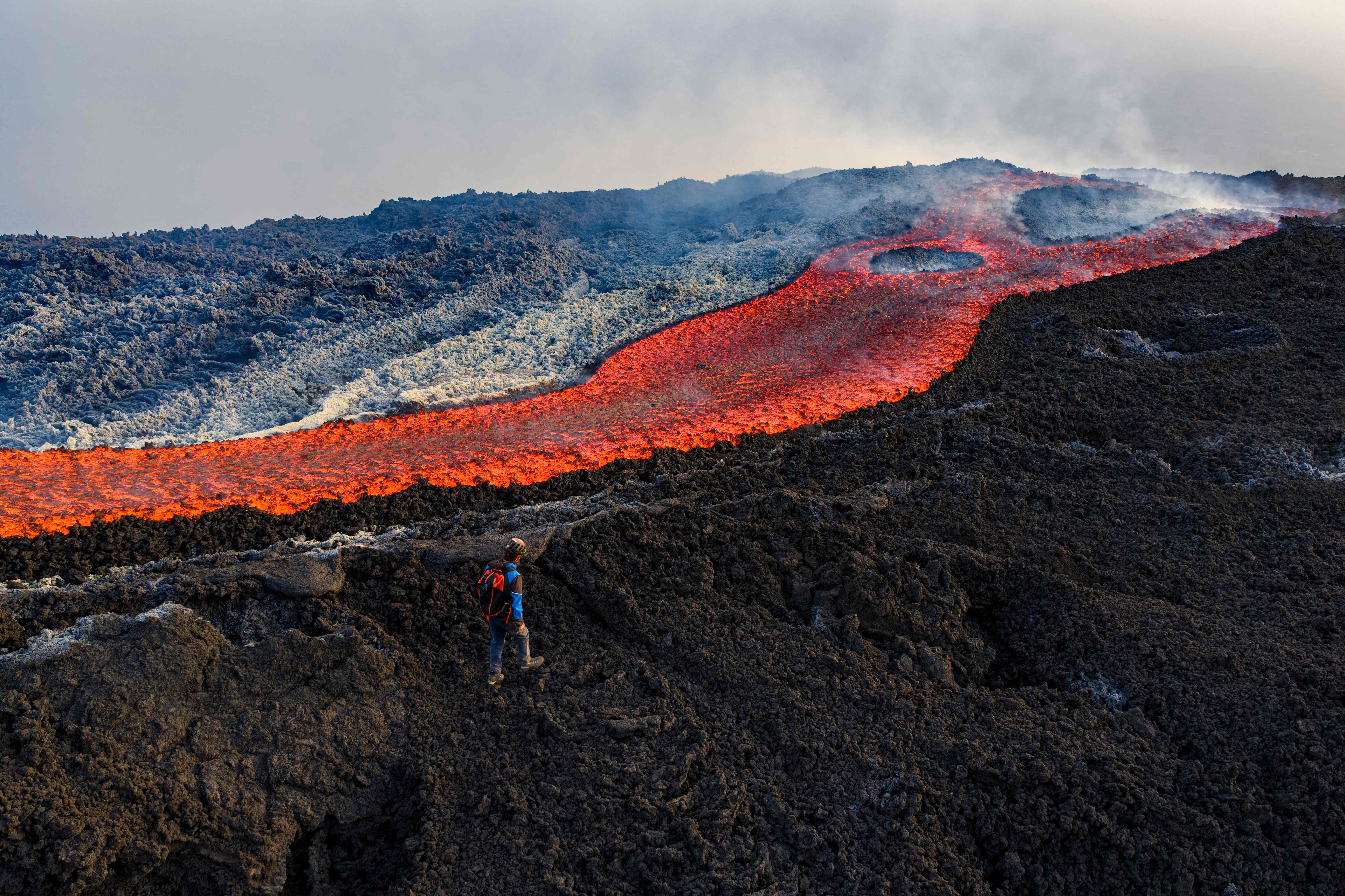 This aerial view shows a man standing near a flow of lava on the Mount Etna volcano (Torre del Filosofo - Etna Sud) on August 28, 2025. The Etna volcanic eruption started on August 10 and remain active the last weeks. (Photo by Giuseppe Distefano/AFP Photo)