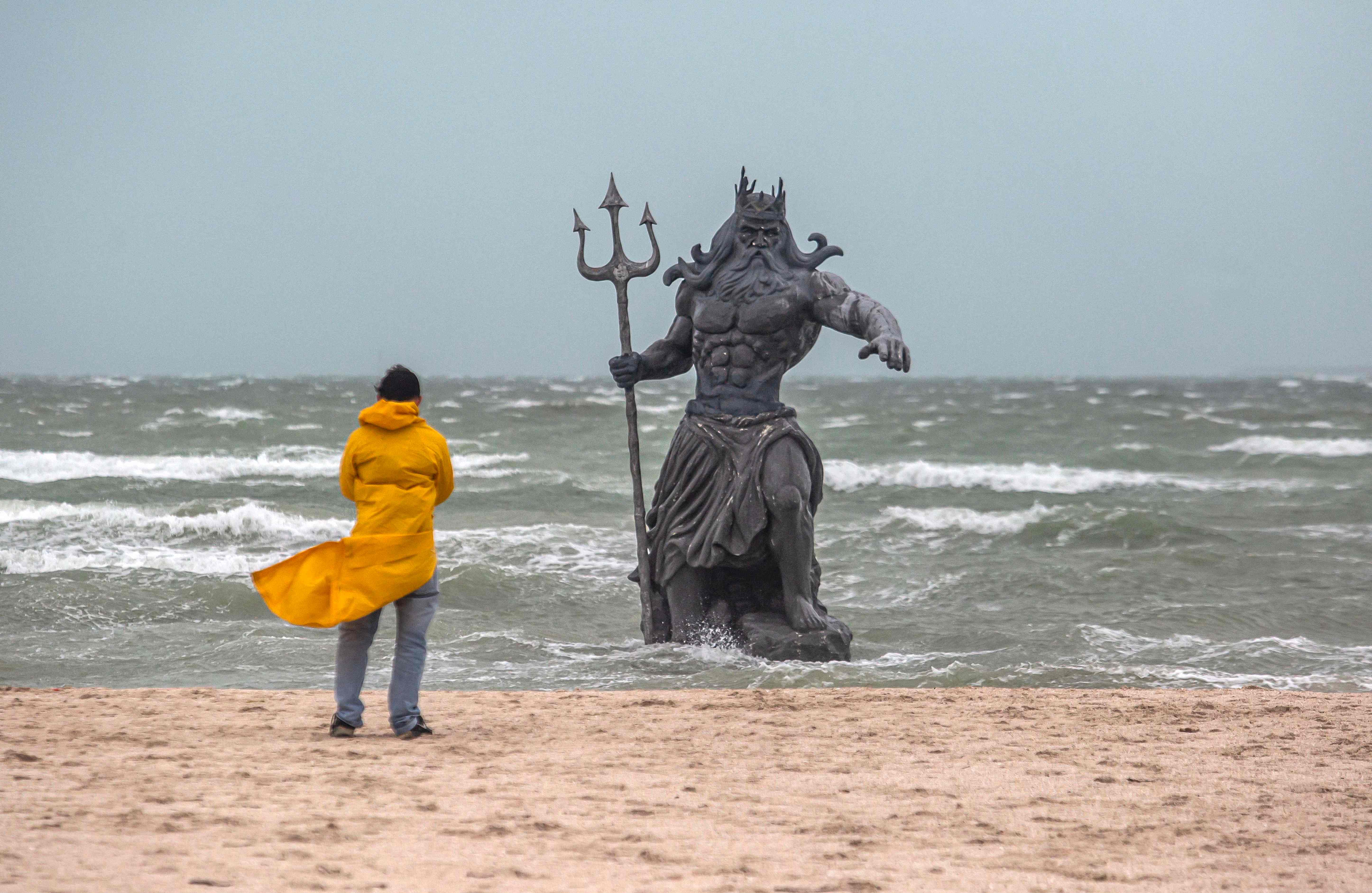 A man looks at a statue of the Greek god Poseidon on a beach during the passage of tropical storm Beryl in Progreso, on the Yucatan Peninsula, Mexico, on July 5, 2024. Beryl weakened to a tropical storm Friday after hitting Mexico as a Category 2 hurricane, with fierce winds causing material damage but no injuries along the tourist-rich Yucatan Peninsula. (Photo by Hugo Borges/AFP Photo)