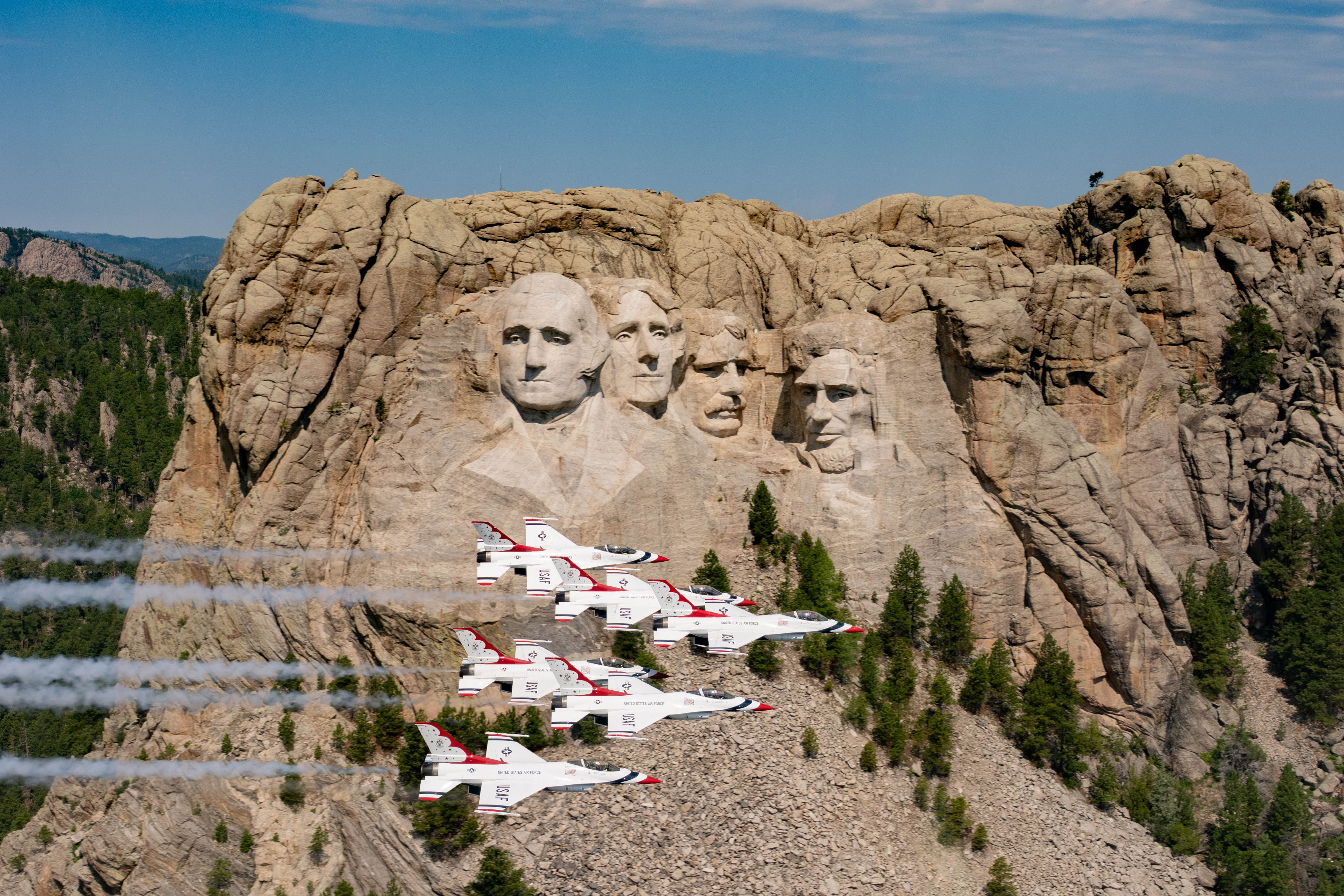 The United States Air Force Air Demonstration Squadron “Thunderbirds”, perform a photo chase over Mt. Rushmore National Memorial, South Dakota, on July 25, 2025. Incredible scenes see a US Air Force display team zooming by Mount Rushmore. The Thunderbirds demonstration squadron performed a photo chase at the national memorial in South Dakota on July 25. (Photo by SSgt. Breanna Klemm/USAF/South West News Service)