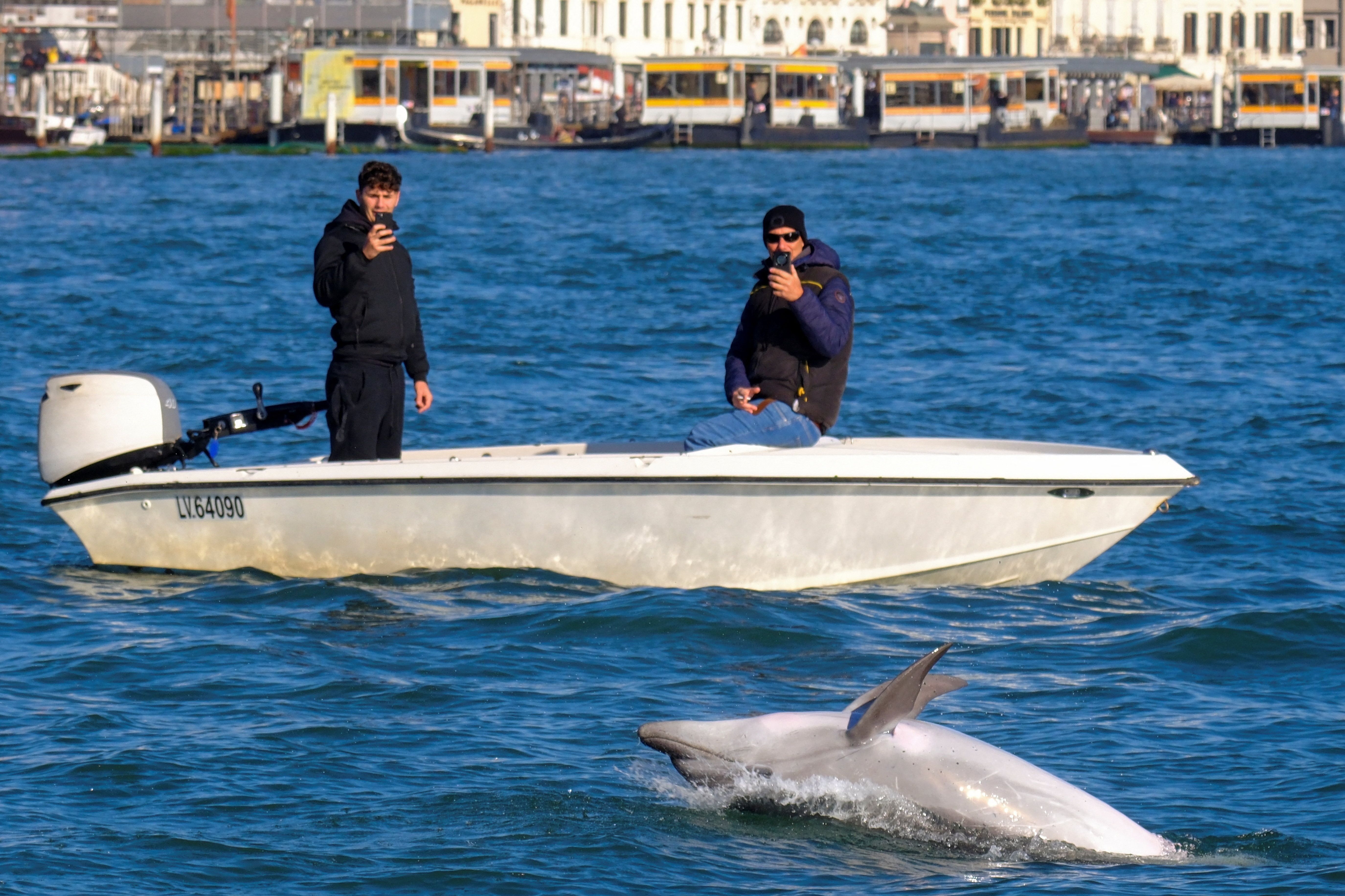 A dolphin nicknamed 'Mimmo' swims as people on a boat take pictures in the San Marco Basin, amid growing concerns about the impact of tourism on marine life, in Venice, Italy, on November 8, 2025. (Photo by Manuel Silvestri/Reuters)