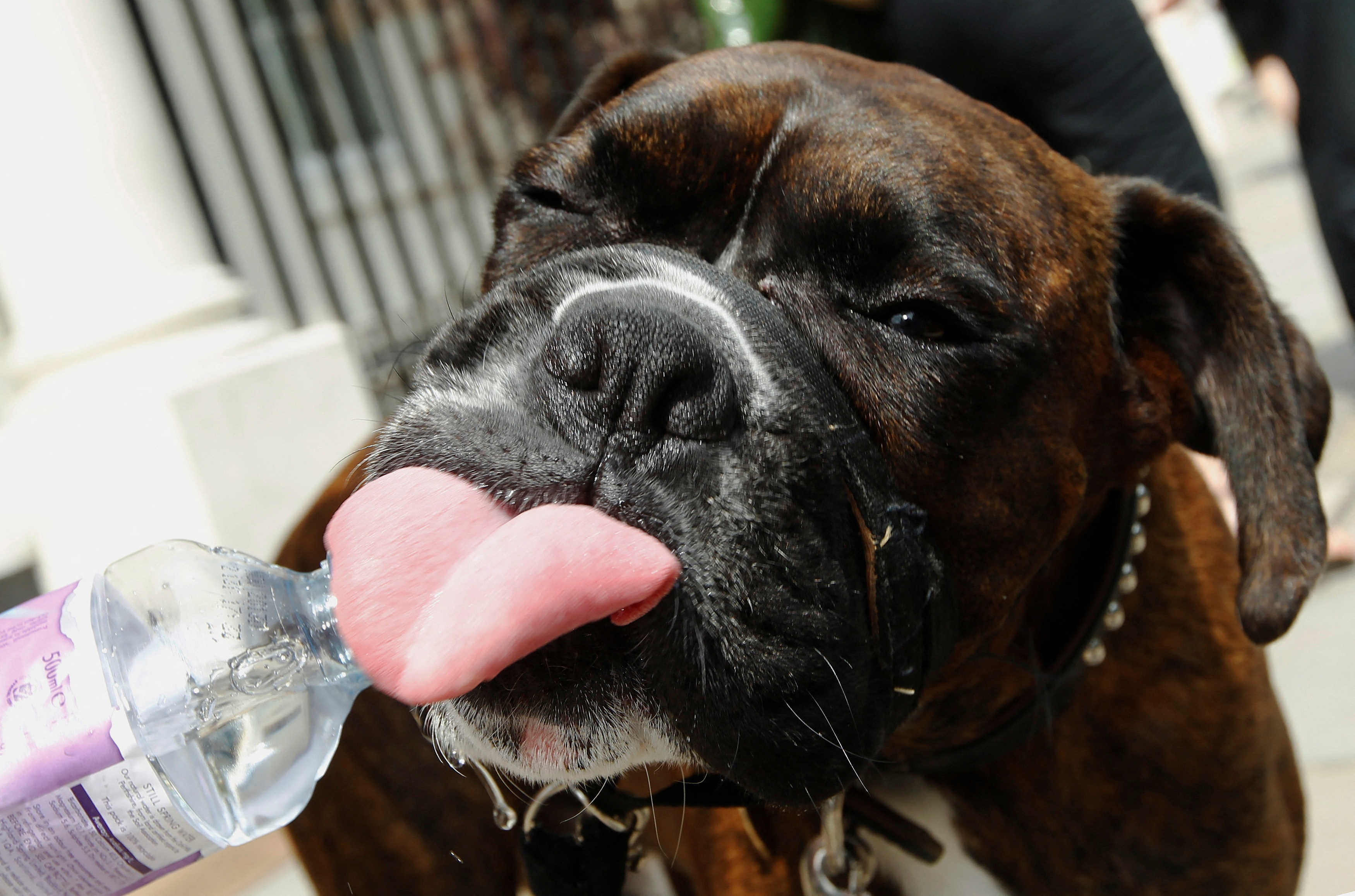 Cooper, a boxer dog drinks water from a bottle to cool down in the hot weather in London on May 29, 2012. (Photo by Luke MacGregor/Reuters)