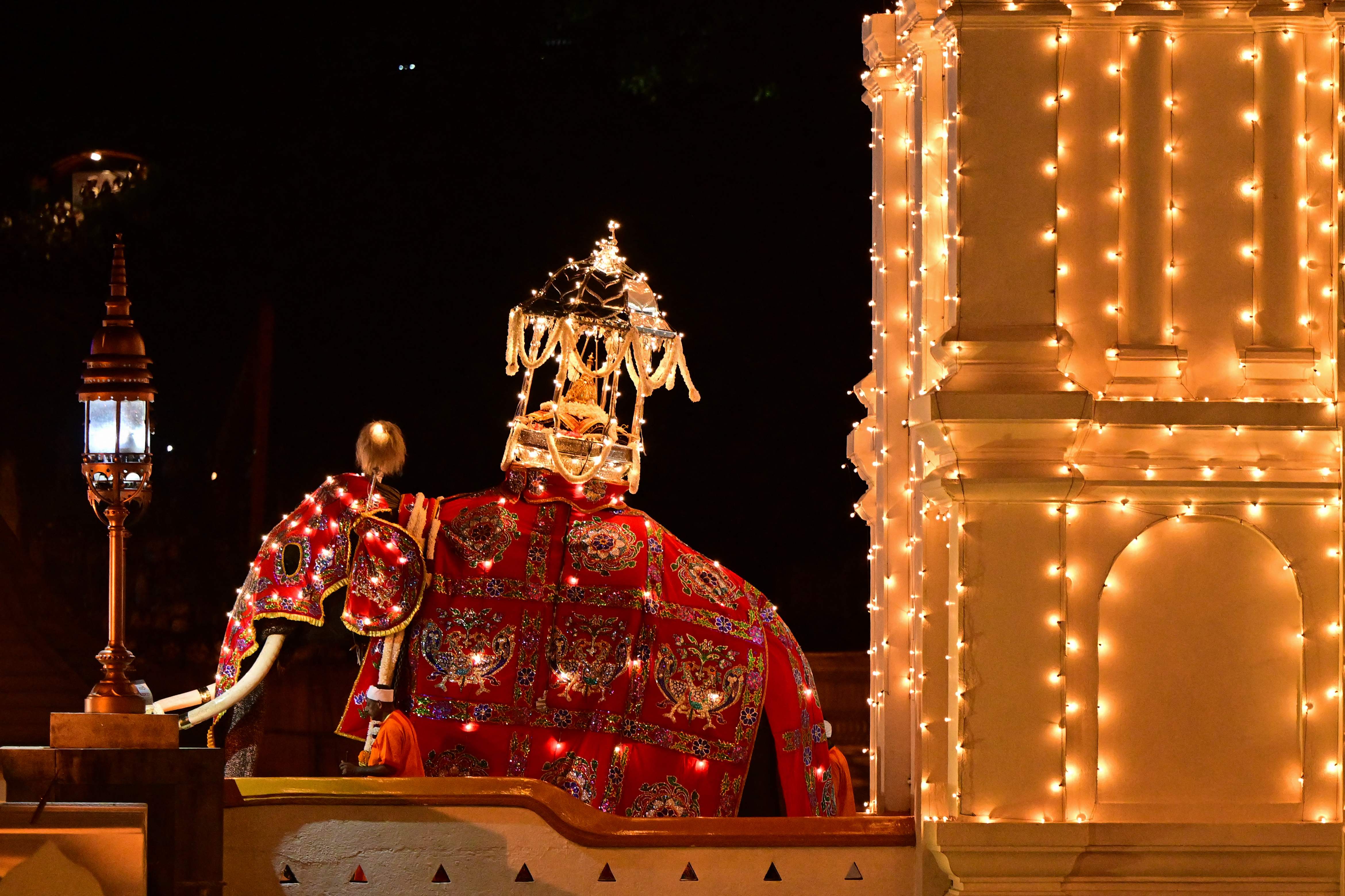A decorated elephant carrying the sacred golden casket housing Lord Buddha's revered tooth relic, walks past the historic Buddhist Temple of the Tooth, as part of celebrations to mark the Buddhist festival of Esala Perahera, in the ancient hill capital of Kandy, on August 8, 2025. (Photo by Ishara S. Kodikara/AFP Photo)