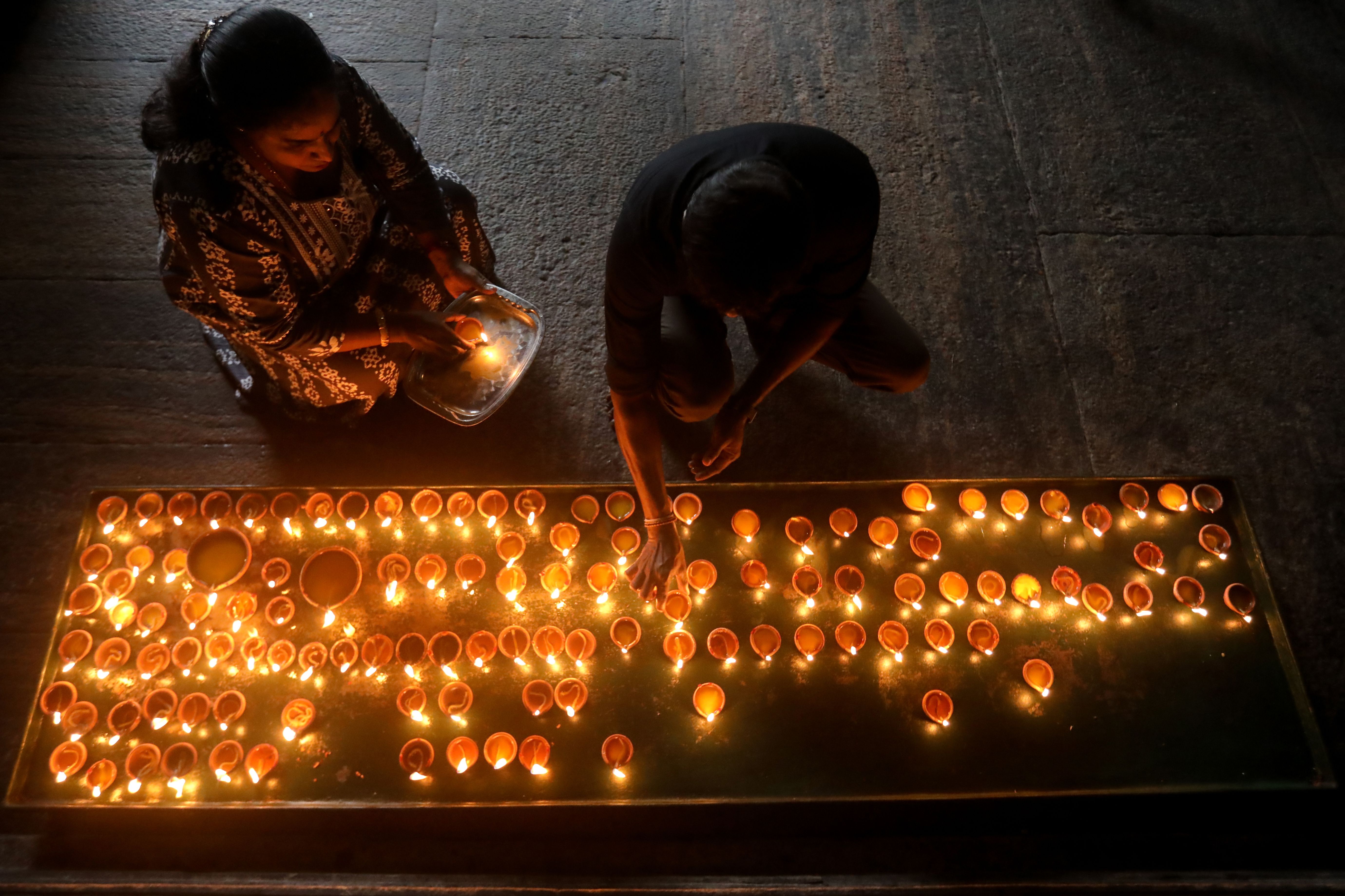 Sri Lankan Hindu devotees light oil lamps during the Diwali festival at a Hindu temple in Colombo, Sri Lanka, 20 October 2025. Diwali, one of the most popular festivals in Hinduism, is celebrated by Hindus worldwide. Also known as the Festival of Lights, it symbolizes the victory of good over evil and commemorates Lord Rama's return to his kingdom, Ayodhya, after a 14-year exile. (Photo by Chamila Karunarathne/EPA)