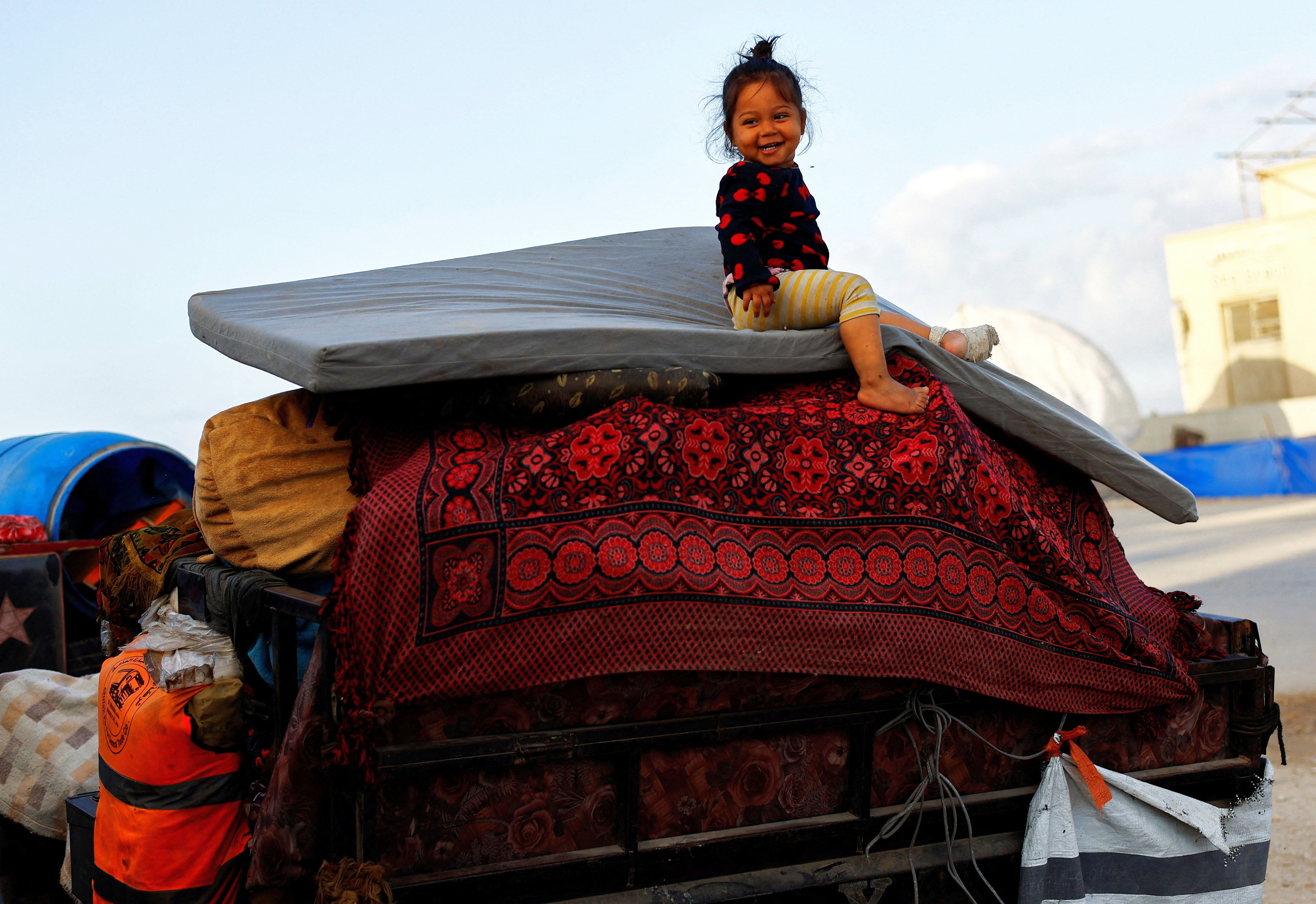 A child sits atop belongings on a vehicle as Palestinians, who were displaced to the southern part of Gaza at Israel's order during the war, attempt to return to the north, after Israel's government ratified a ceasefire with Hamas, in the central Gaza Strip on October 10, 2025. (Photo by Mahmoud Issa/Reuters)