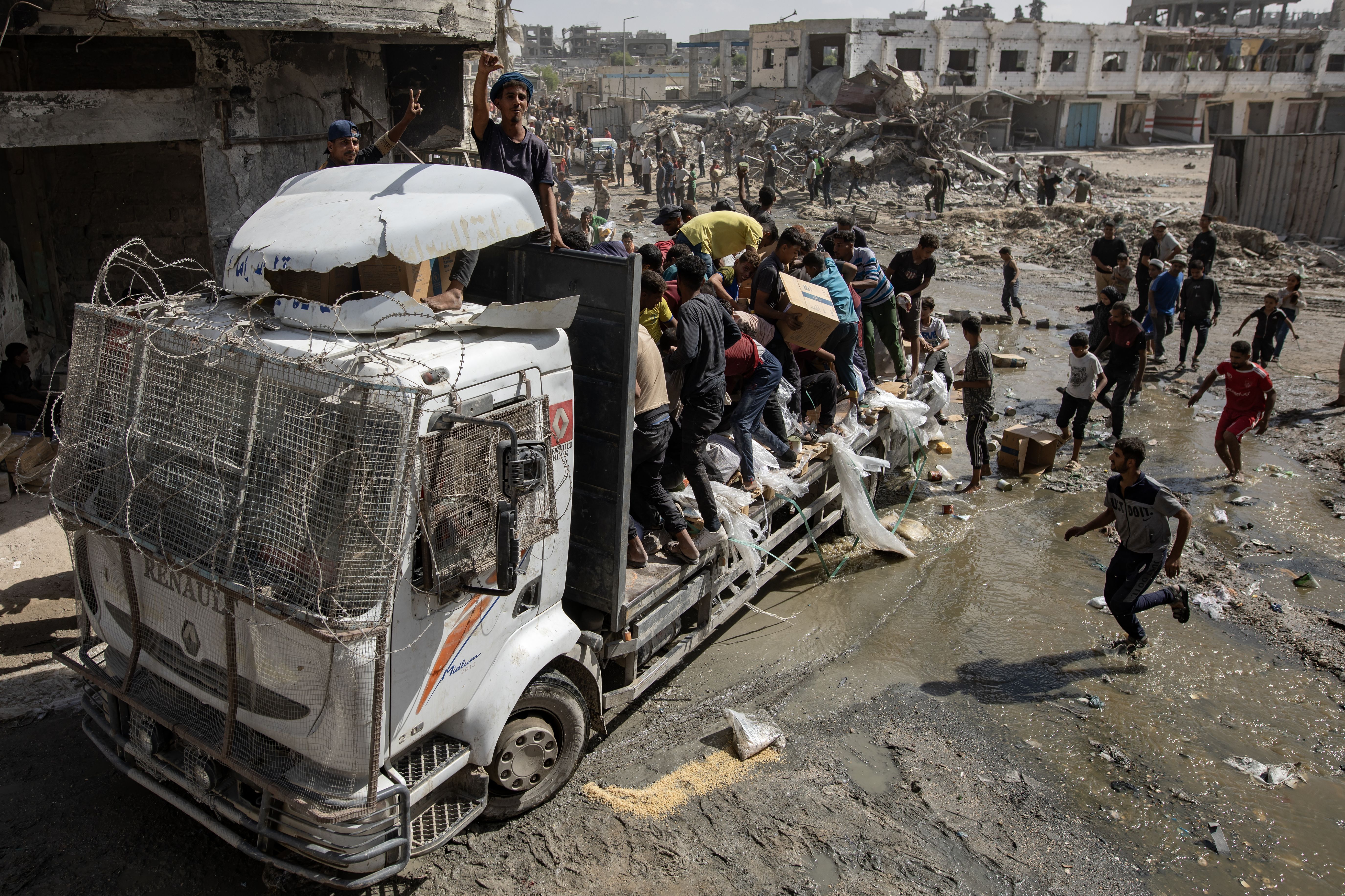 Palestinians take aid supplies from trucks that arrived in Khan Yunis in the southern Gaza Strip, 11 October 2025. Israeli Prime Minister Benjamin Netanyahu's office announced that the Israeli government had approved the Gaza ceasefire and hostage release plan. (Photo by Haitham Imad/EPA)