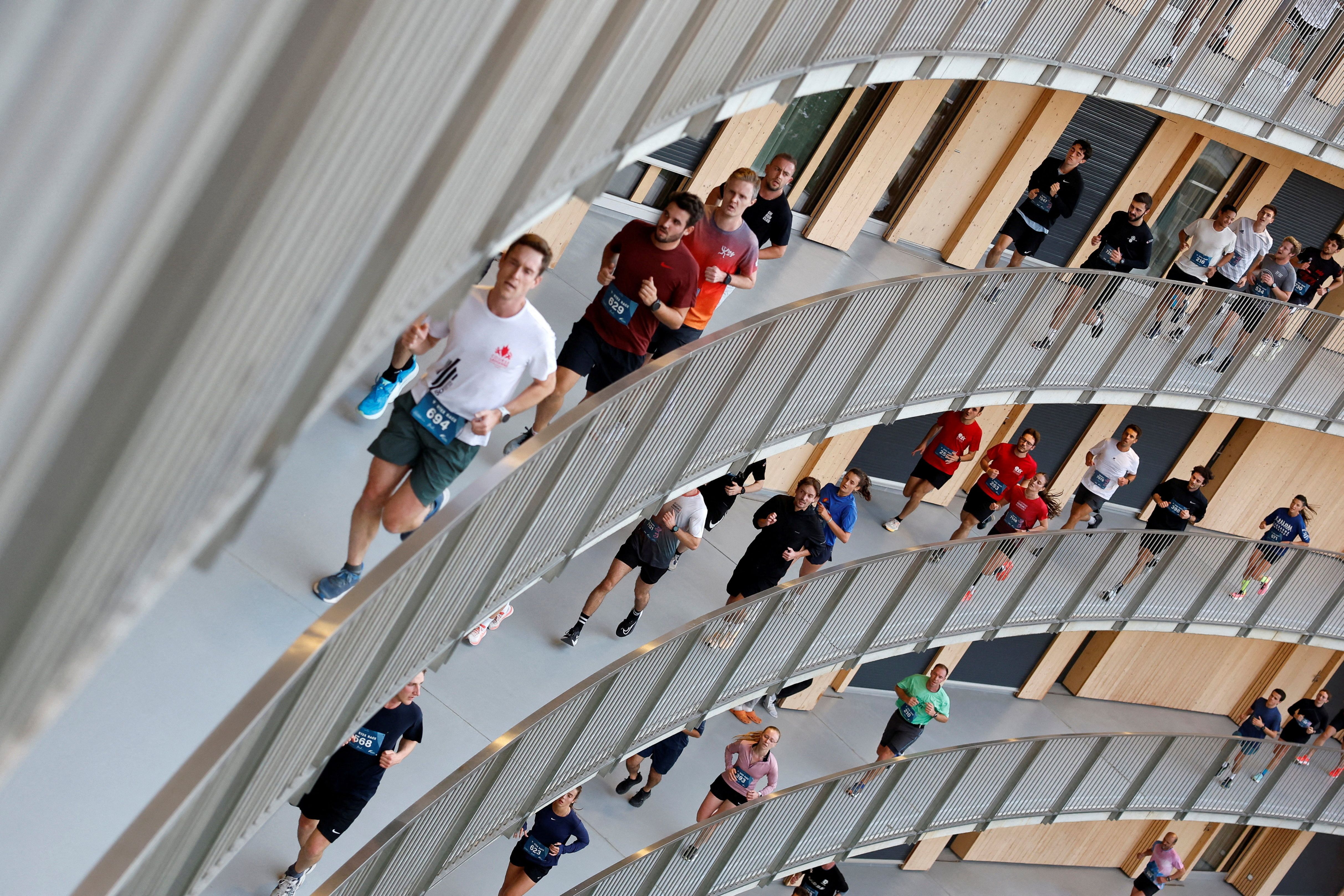 Runners climb the ramp during the Vortex Race, created by students inside the Vortex, an eight-storey circular building with a 2.8-kilometre helicoidal ramp with a 1% incline housing 941 rooms for the University of Lausanne, in Chavannes-près-Renens, Switzerland, on October 16, 2025. (Photo by Stefan Wermuth/Reuters)