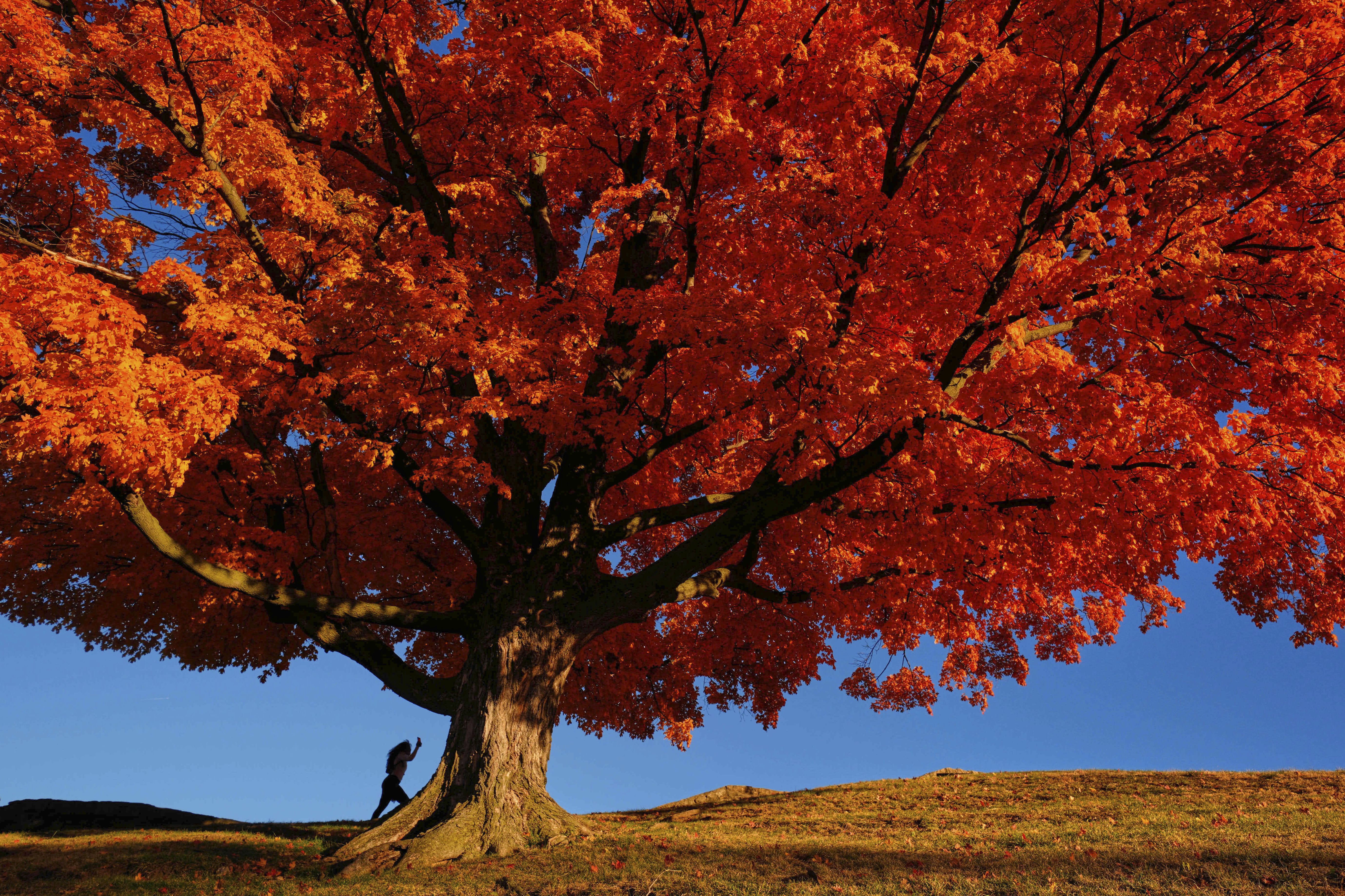 A person walks past a maple tree displaying fall colors Friday, November 7, 2025, in Kansas City, Mo. (Photo by Charlie Riedel/AP Photo)